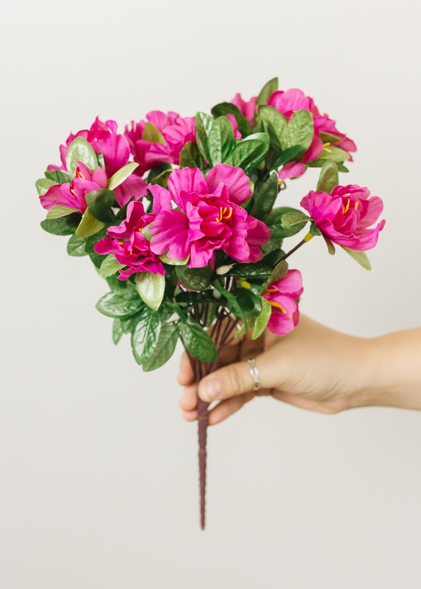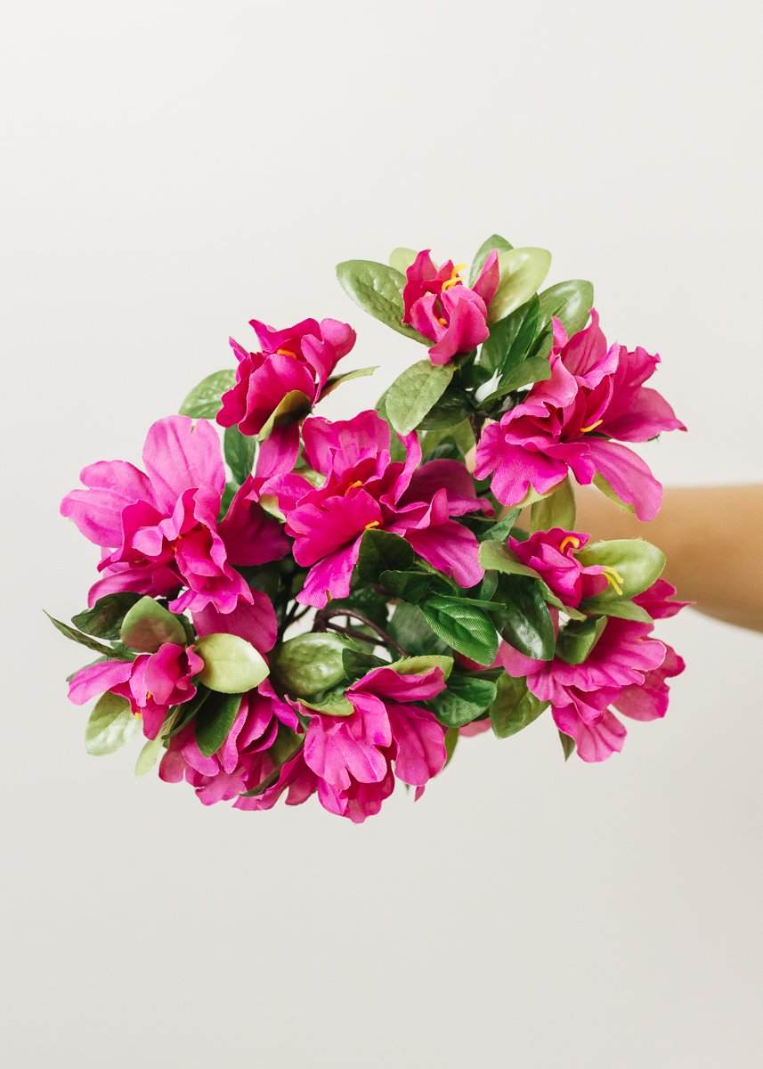 Azalea silk flower bush in fuchsia pink. Use alone or combine multiples to create a classic arrangement. Color may fade in direct sunlight. Add a UV Protectant Spray to keep color vibrant.