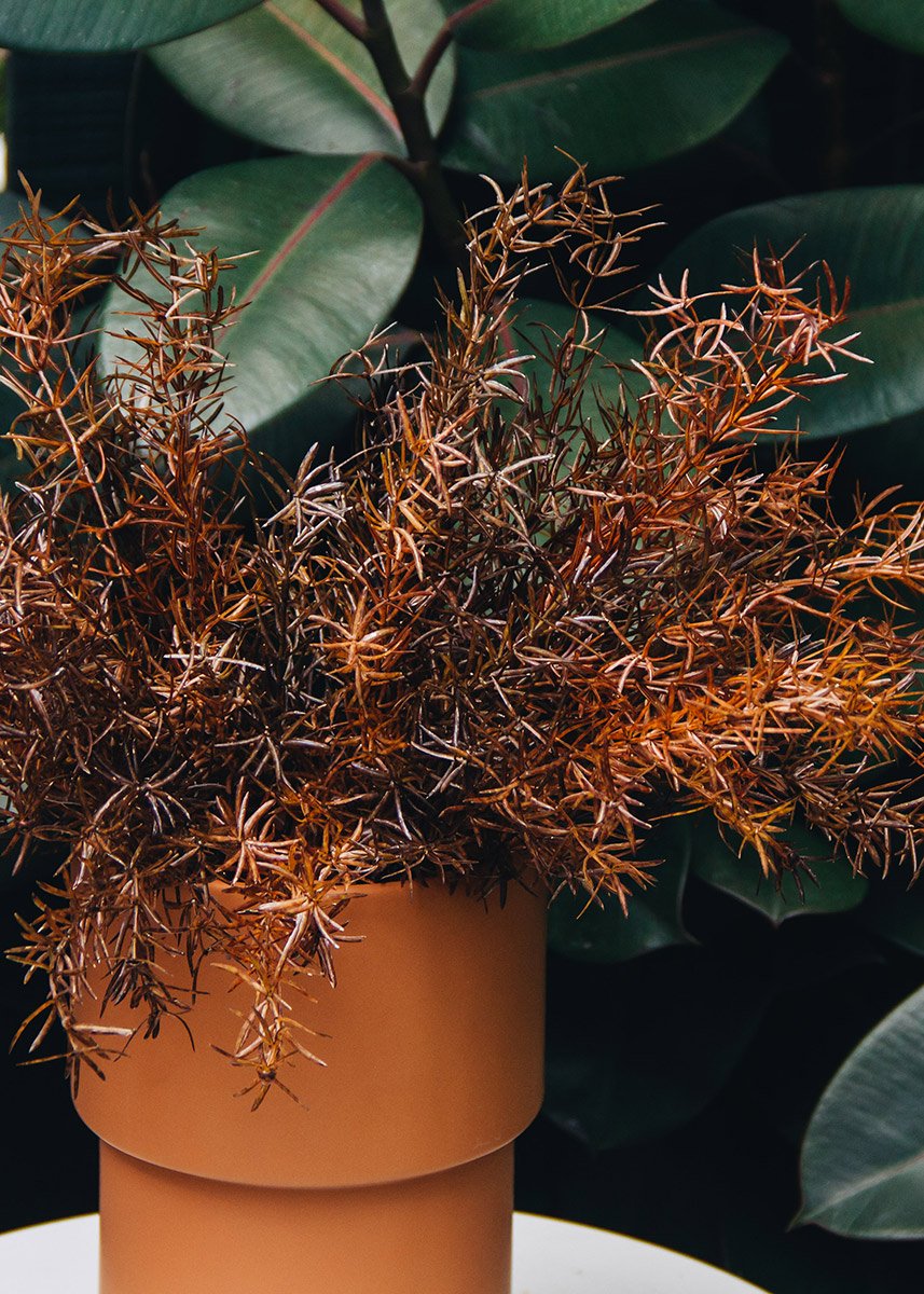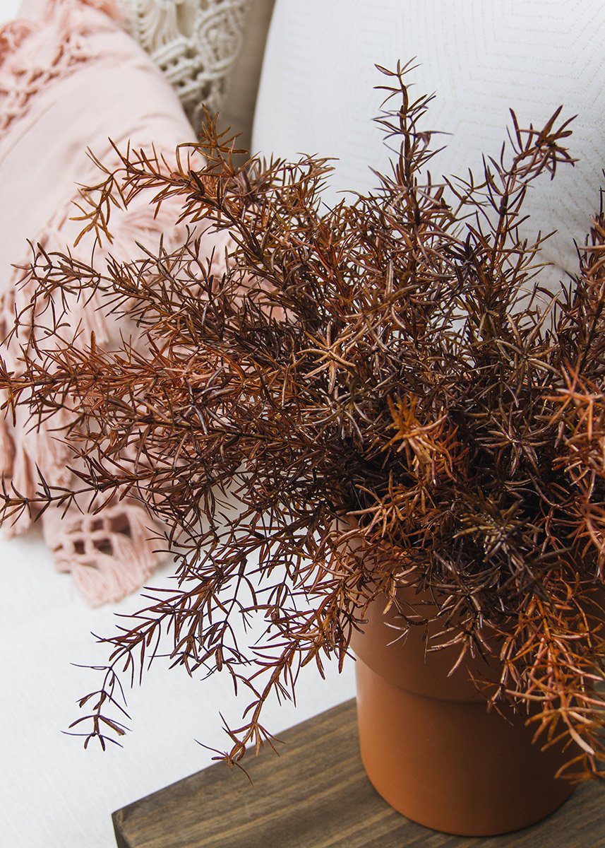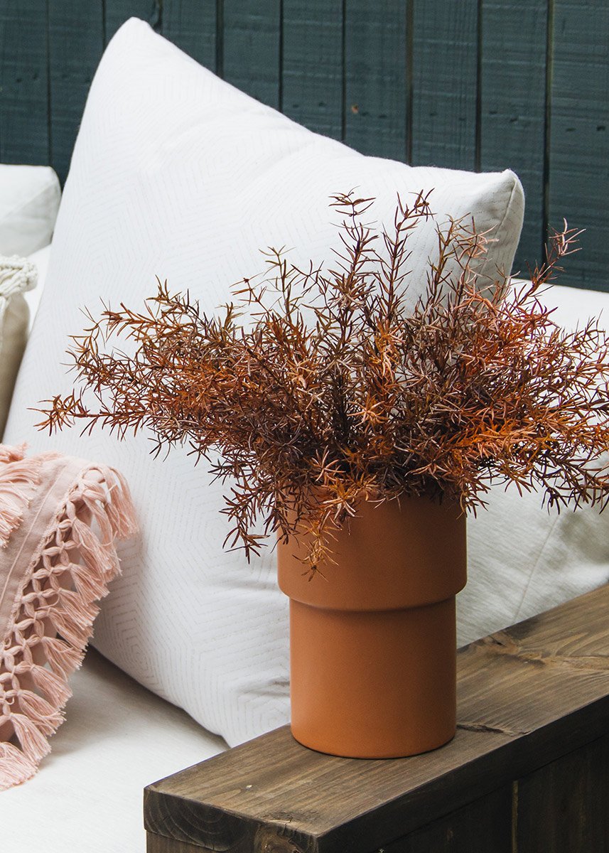 Find outdoor fake plants, like this plastic artificial sprengeri grass bush in brown. Simply place in a planter and you have the perfect centerpiece for your porch table.