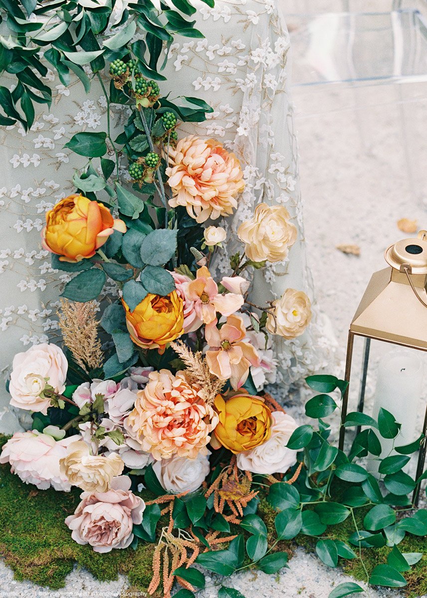 Rich fall colors for your DIY wedding flowers bouquet are found in this stunning golden mustard yellow fake English rose. It has orange burgundy accents.