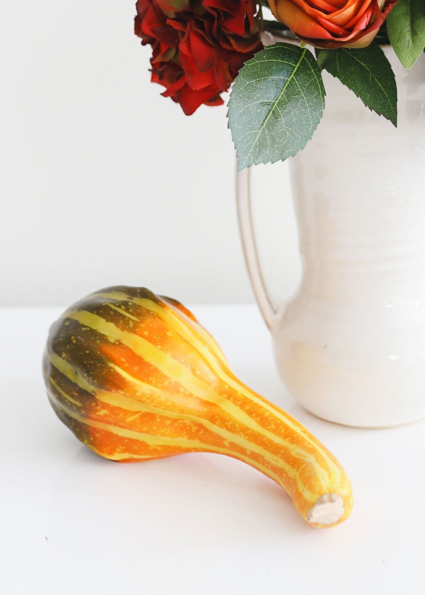 Find autumn decorations, like this fake plastic crooked neck gourd in yellow orange and green. It will be a festive addition to your fall wedding tablescapes or Thanksgiving table centerpieces.