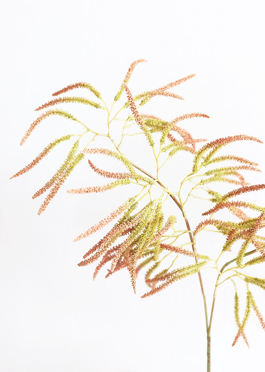 Find artificial fall flowers, like this fake amaranthus flower branch in rust brown and green. The hanging blooms are great to add cascading detail to your autumn arrangements and bridal bouquets.