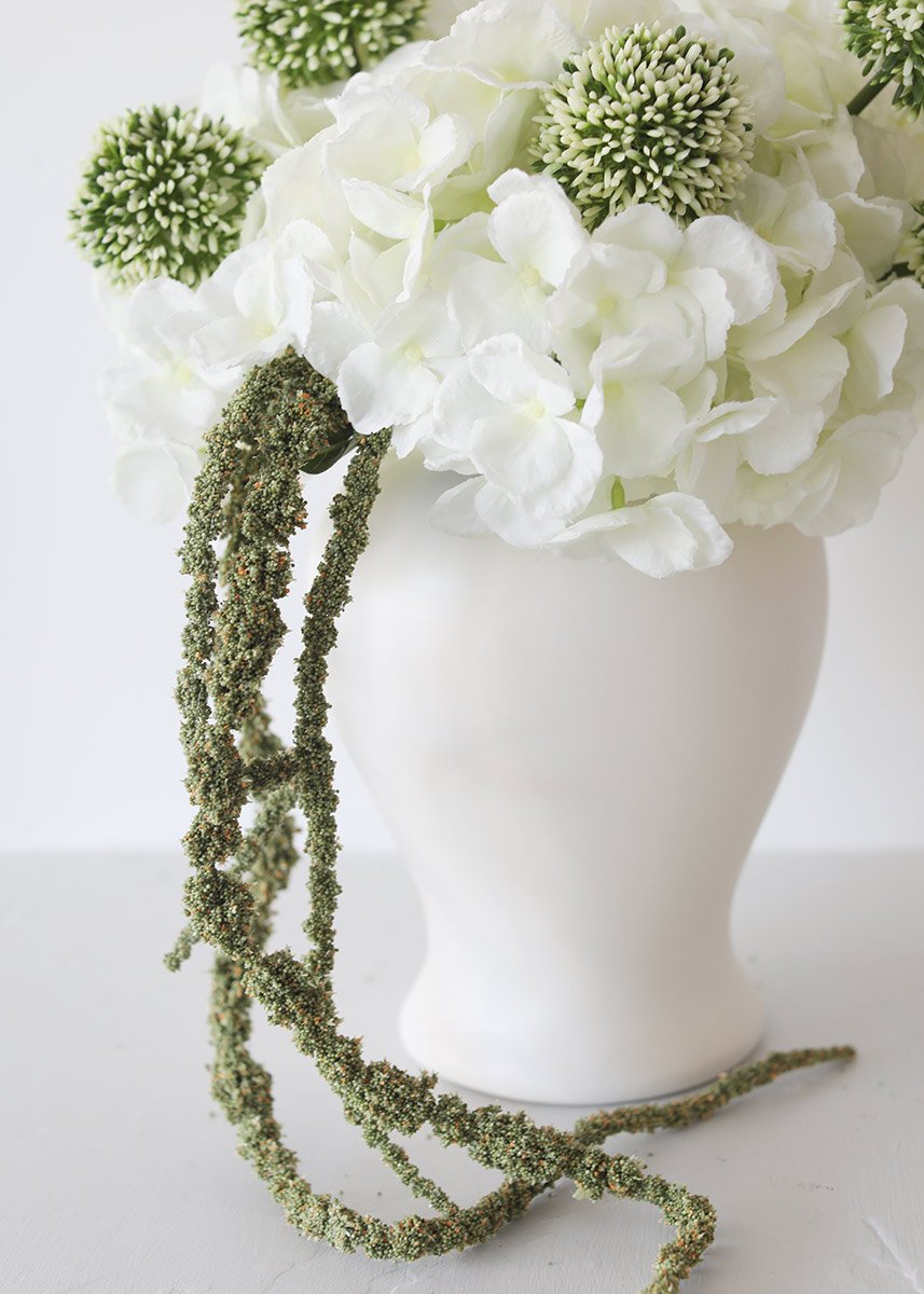 Gorgeous amaranthus spray in vivid green. Also known as a summer poinsettia, this green amaranthus adds texture to hanging centerpieces and cascading wedding bouquets.