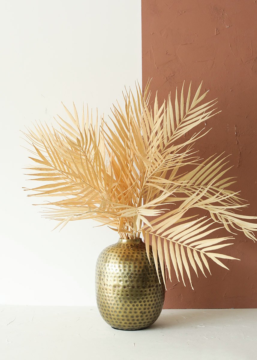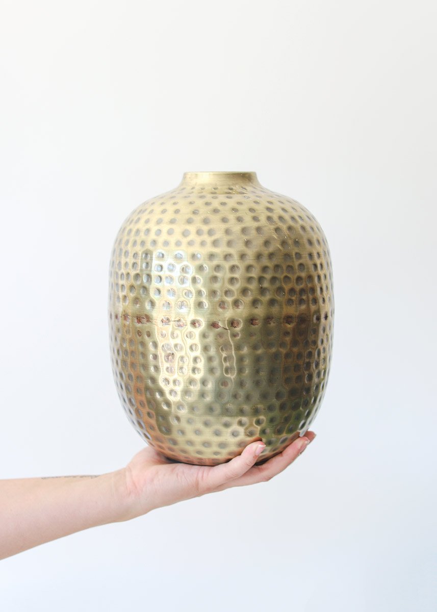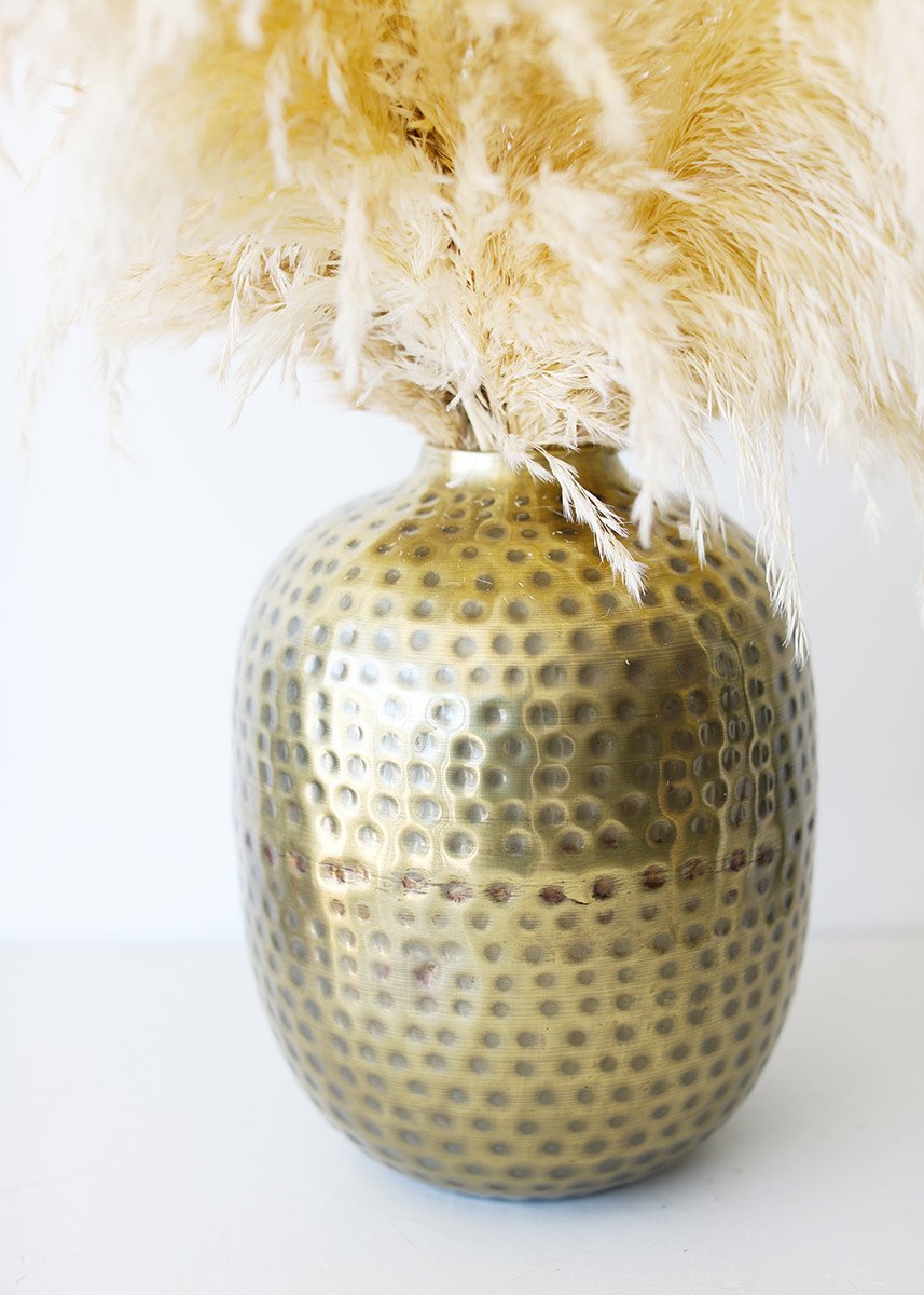 Floral vases for the home offer an easy solution for decorating your space. All this beautiful antique brass hammered metal round table vase needs is your favorite dried flowers and grasses.