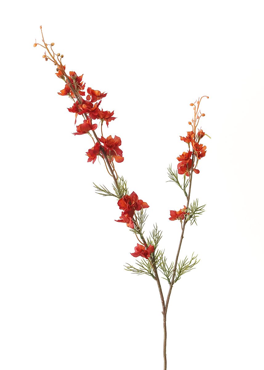 Find artificial fall flowers for your fall home decor arrangements, like this stunning orange fake delphinium flower stem. The bold autumn color of these larkspur wildflowers makes any floral design pop.