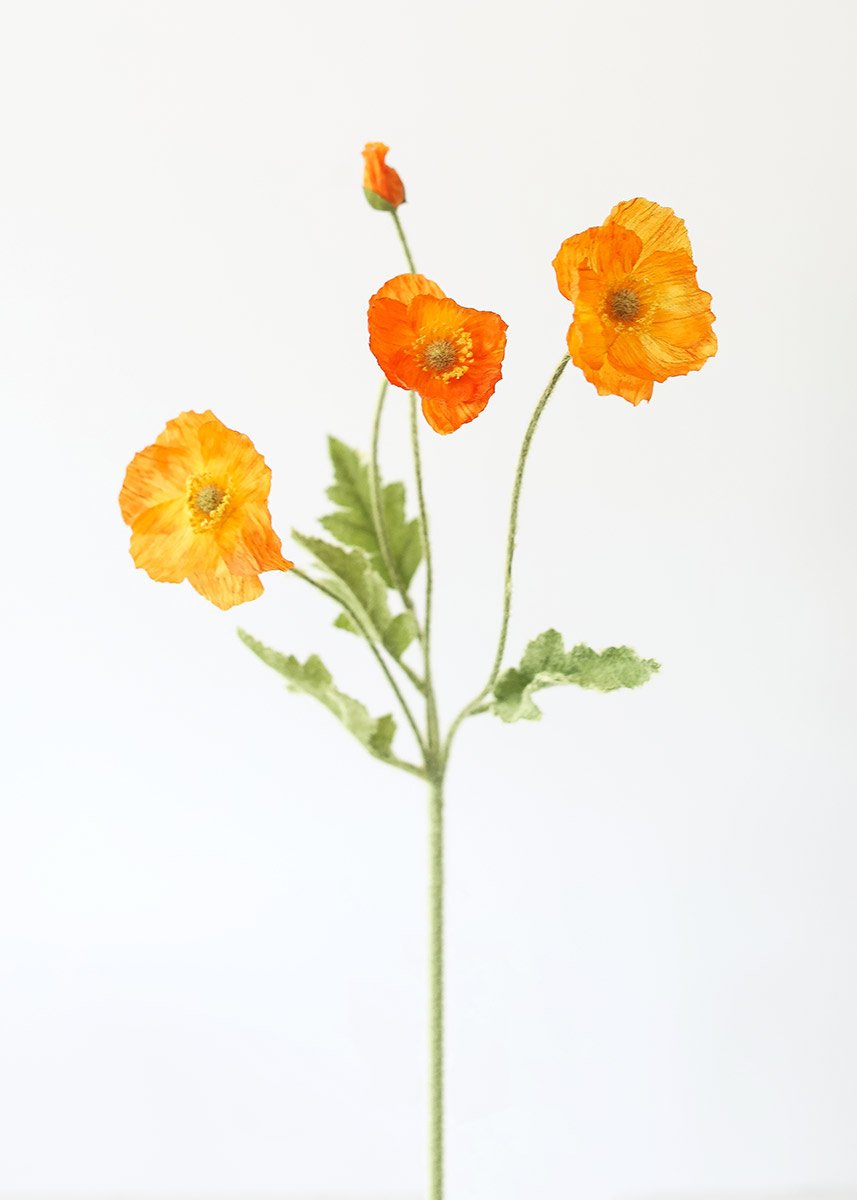 Looking for orange artificial wedding flowers? Check out this adorable, faux silk poppy wildflower spray in orange with a flocked green stem. Create bright and beautiful DIY wedding bouquets and centerpieces with these orange poppies for a splash of color!