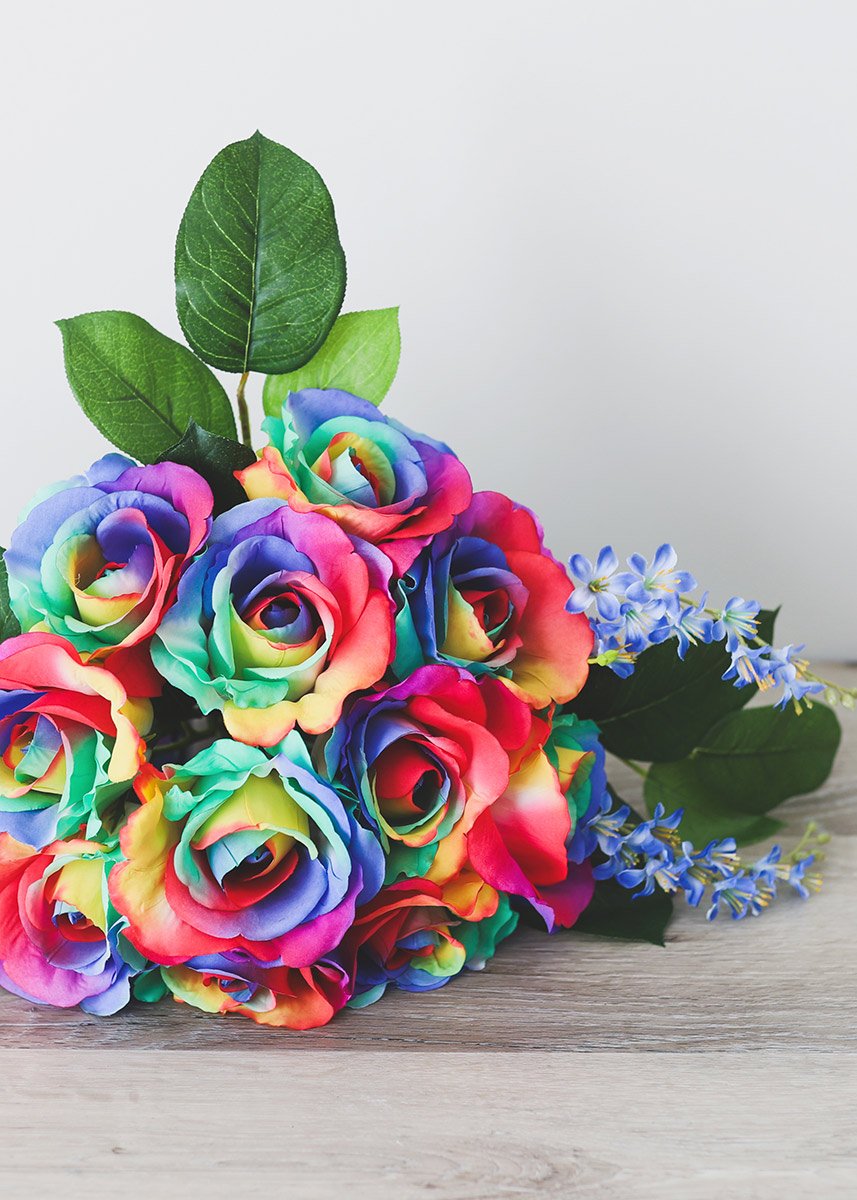 Make a statement with these gorgeous, bold rainbow unicorn fake roses. Gather several stems to DIY a bright, colorful table flowers arrangement.