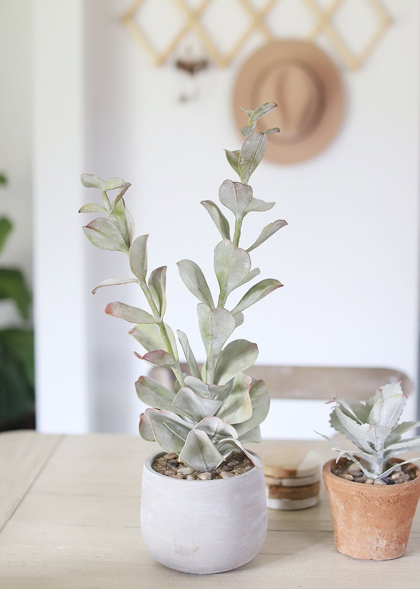 Find fake potted plants, like this beautifully realistic artificial succulent plant in green with a gray hue. It's planted with stones in a gray cement pot. Succulent stems are bendable to create a natural look.