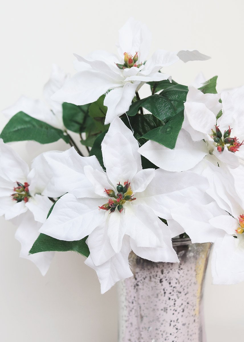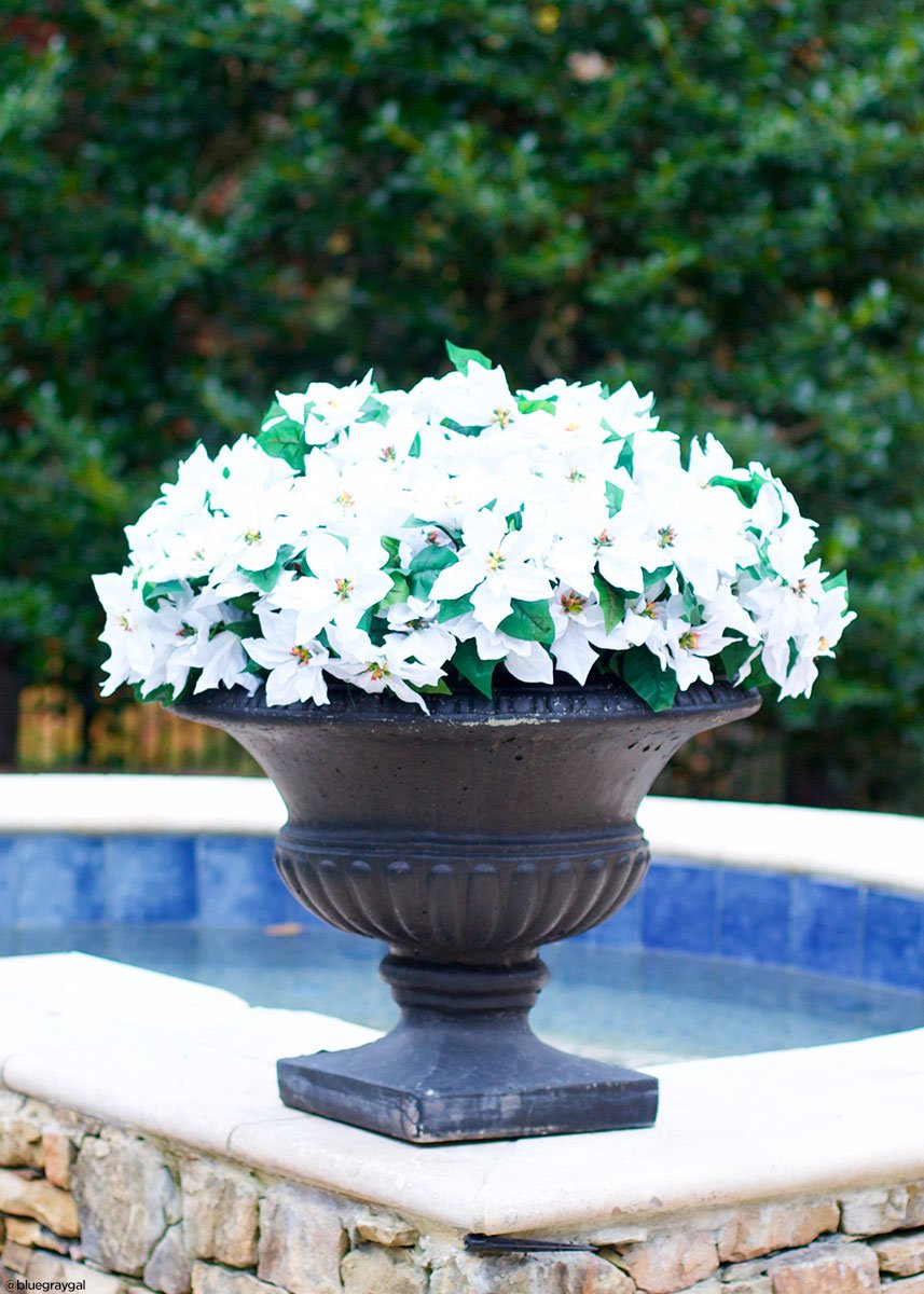 Water resistant poinsettia bush in white. This poinsettia bush is perfect for your outdoor holiday decor. Use alone or in an arrangement with other assorted holiday flowers and greenery.