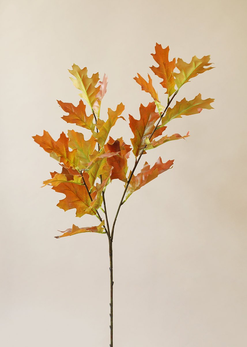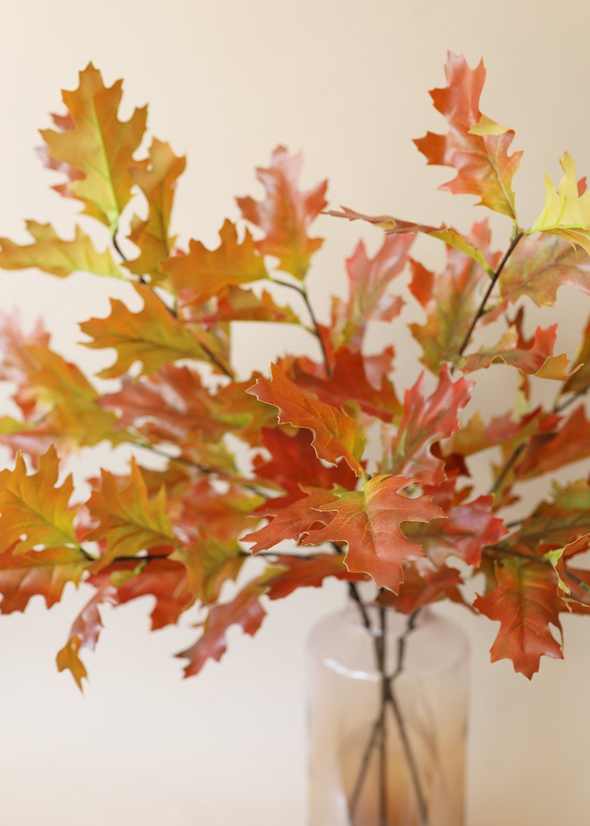 Find artificial fall leaves, like this beautiful autumn orange fake oak leaf branch with hints of golden yellow and red. Easily style into floral wreaths and vase arrangements to ready your home for the harvest season.