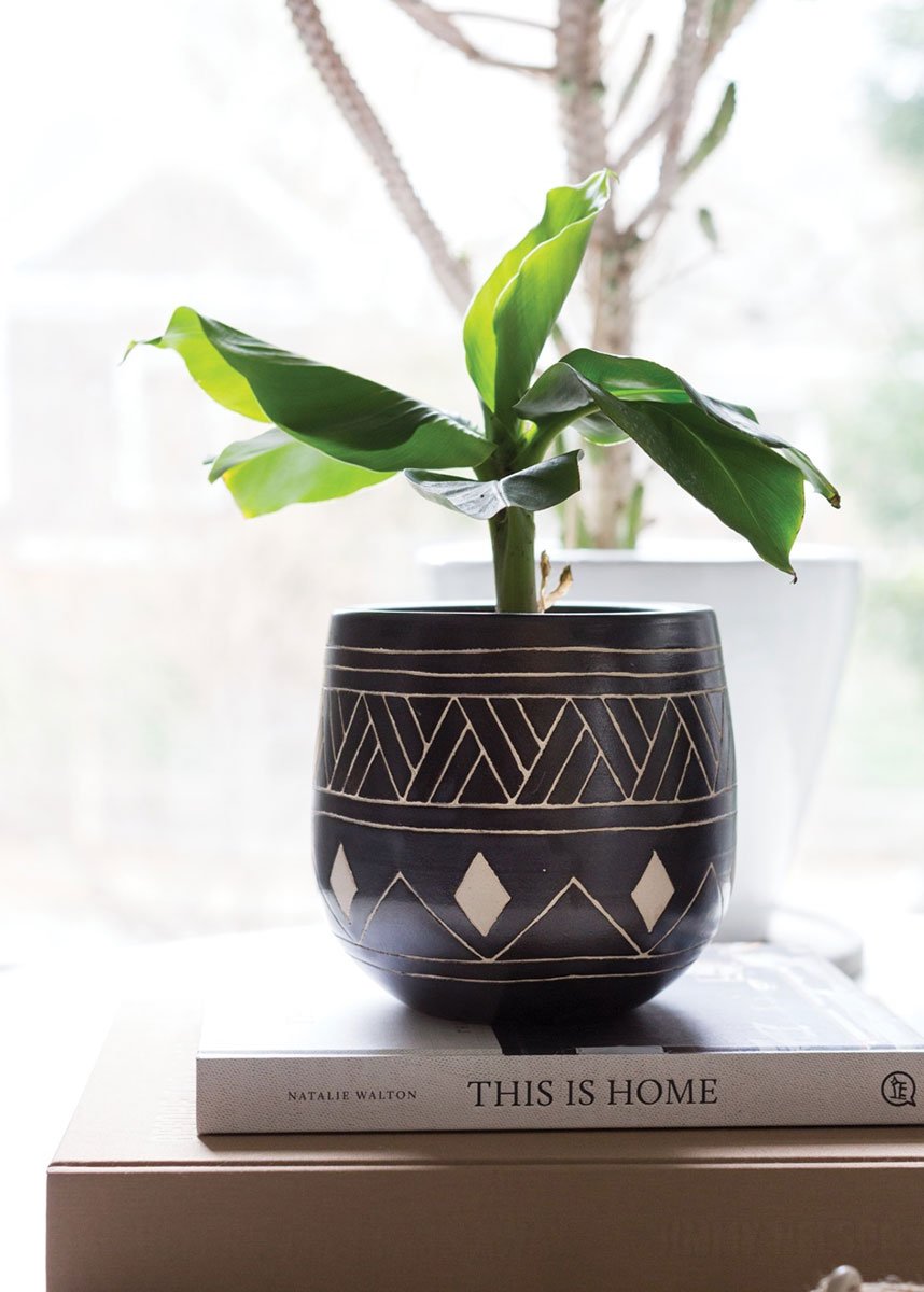 Find tabletop planters, like this stylish black and tan ceramic pot from the Bamba Collection. It features a unique geometric pattern.
