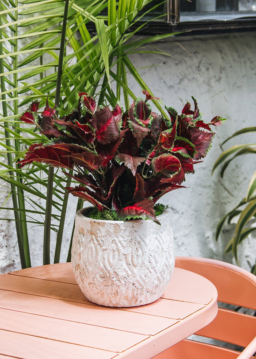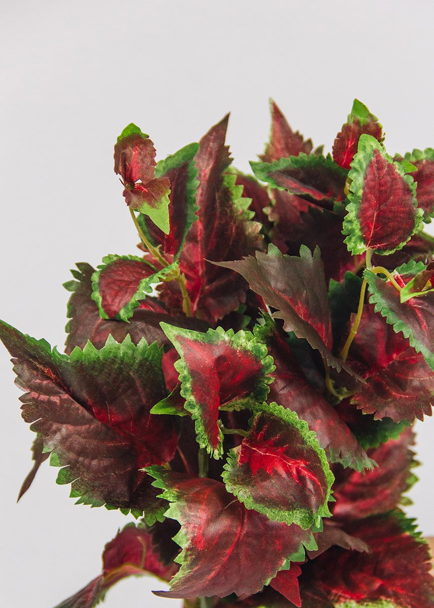 Find UV protected artificial outdoor plants, like this gorgeous coleus bush with variegated burgundy green fake leaves. Such a stunning addition to your porch houseplants.