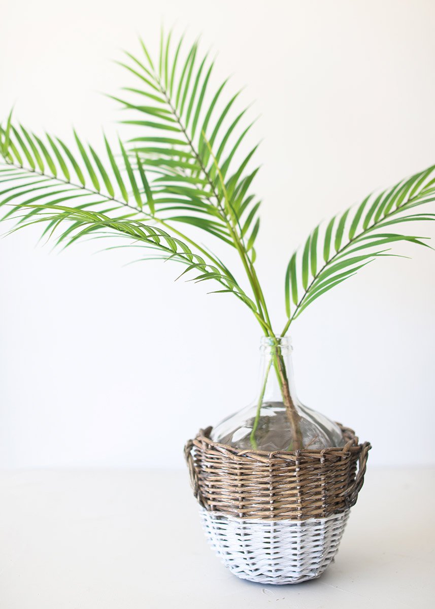 Charming willow wicker basket in brown and white with handles has a clear glass bottle vase inside of it. Add your favorite flowers, and you have an arrangement that completes your country home decor.
