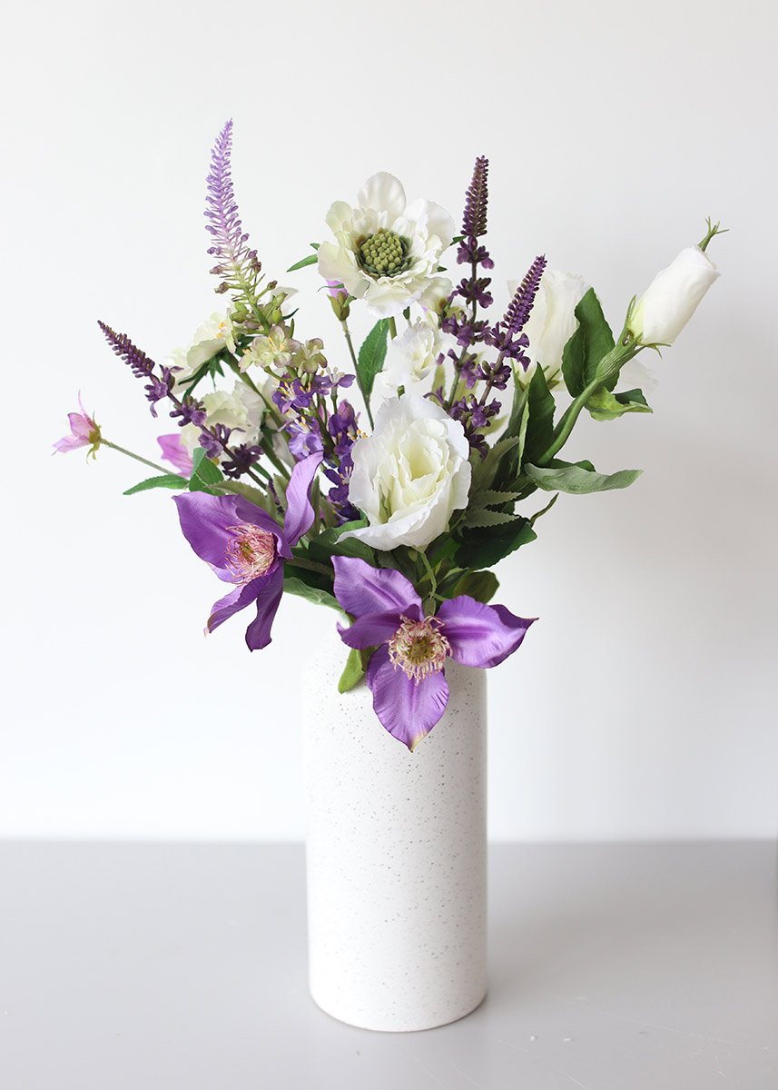 Beautiful cream and multi purple flower bundle features faux lisianthus and scabiosa flowers with fake lavender filler flowers. Drop in a vase, or take apart to use in your wedding floral bouquets.