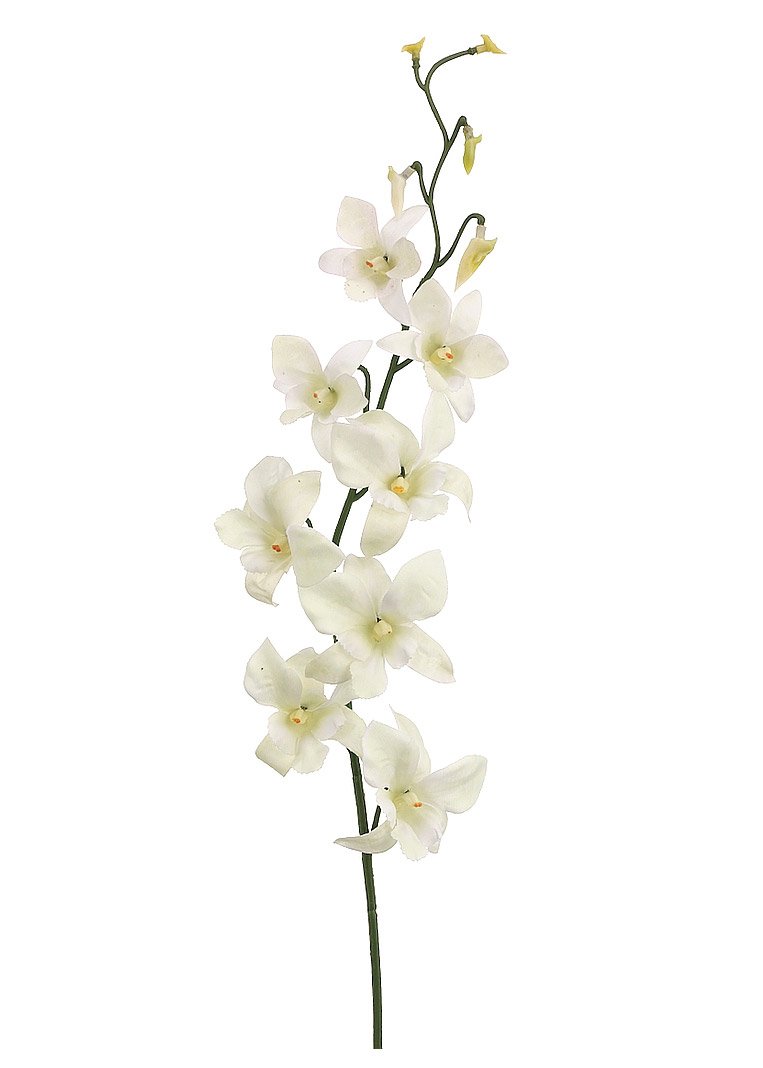 Silk dendrobium orchid spray in cream white with yellow and green highlights. A delicate orchid that would add elegance to any bridal bouquet or tropical arrangement.
