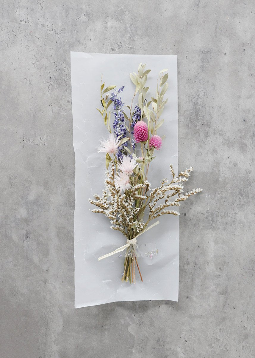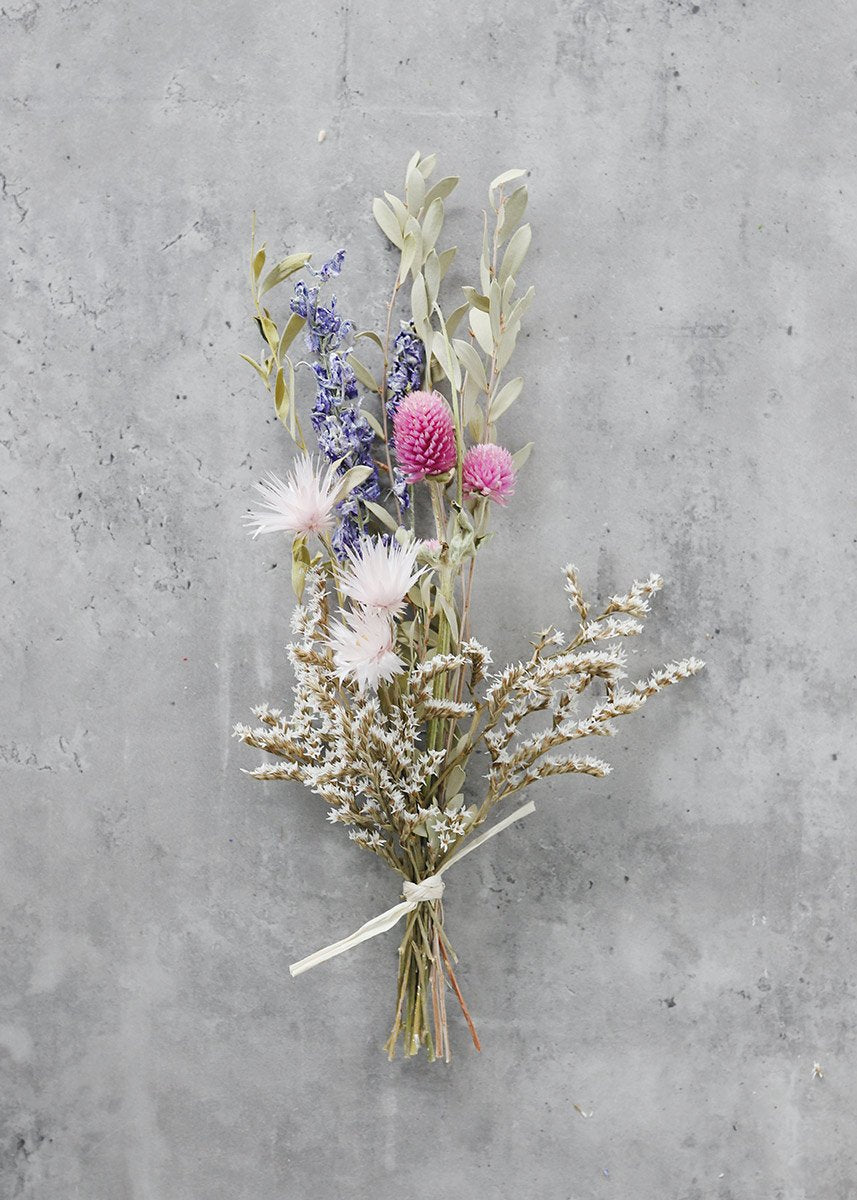This sweet, wild dried flower bouquet features a textured mix of silver daisies, amaranth, german statice, lavender, and greenery. Simply drop the bundle in a vase for an easy dried flower arrangement or separate to create multiple looks for your home decor.