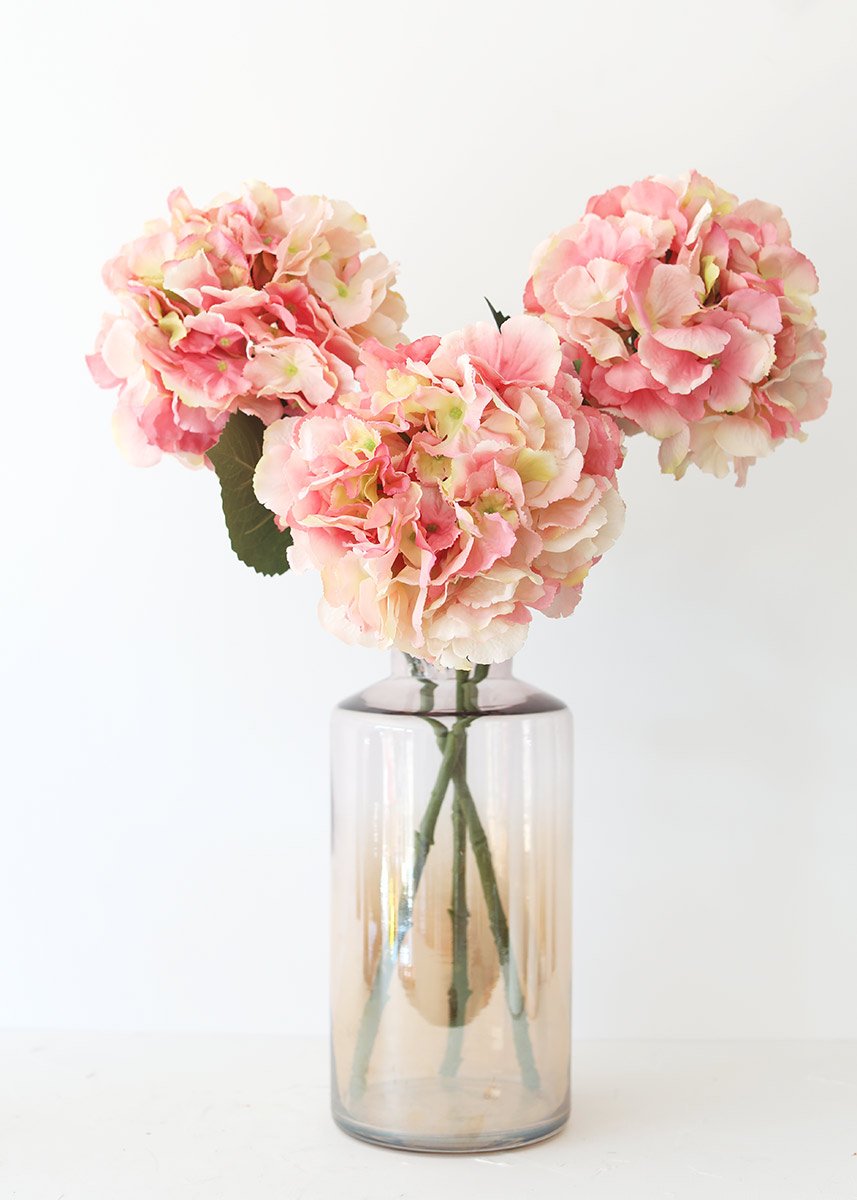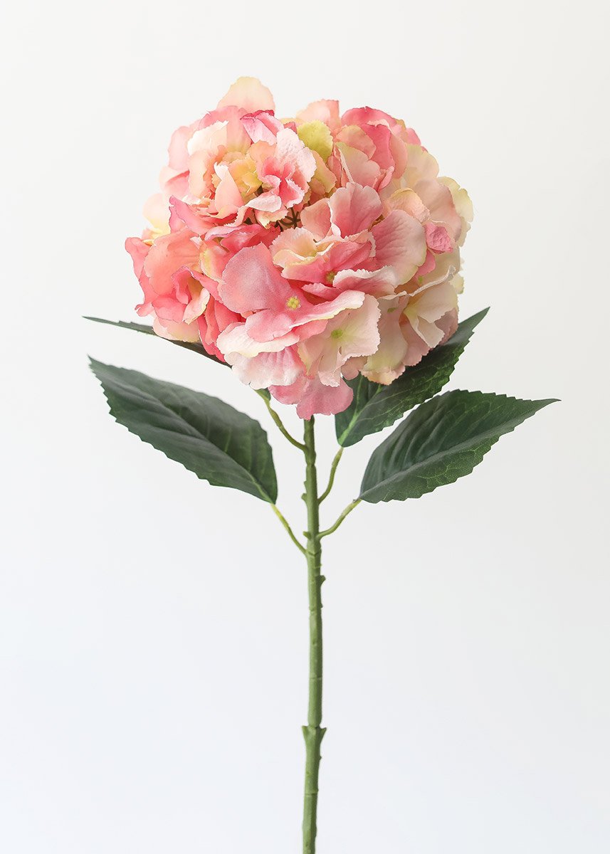 Home styling with fake flowers keeps your space looking bright and fresh. Give any vase arrangement a pretty pop of color with this pink cream artificial silk hydrangea flower stem.