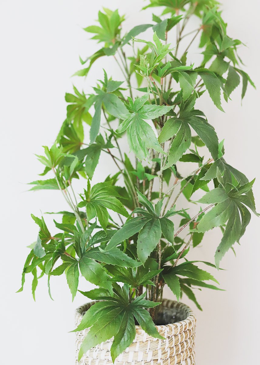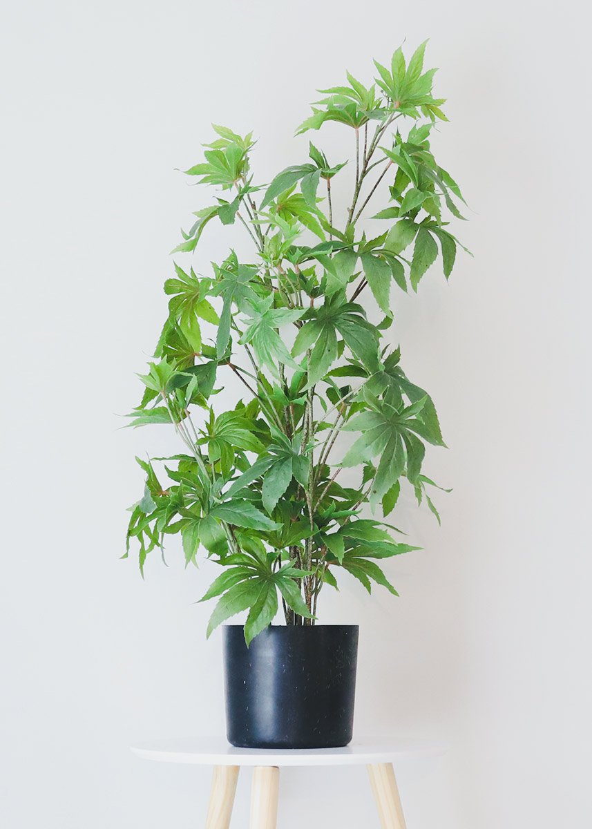 Find artificial plants in pots, like this potted fake marijuana cannabis leaves plant. Fake pot plants are ideal props for cannabis businesses. Or, display as a houseplant in your home.