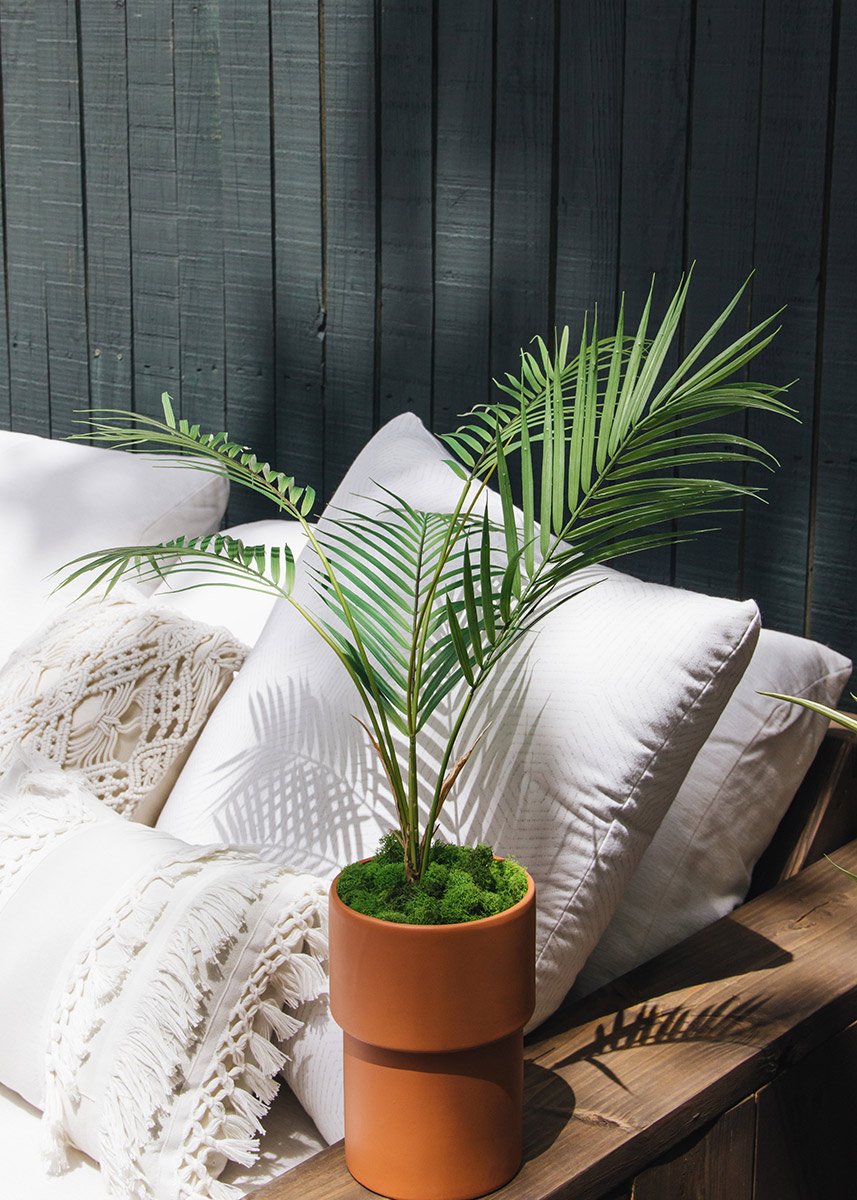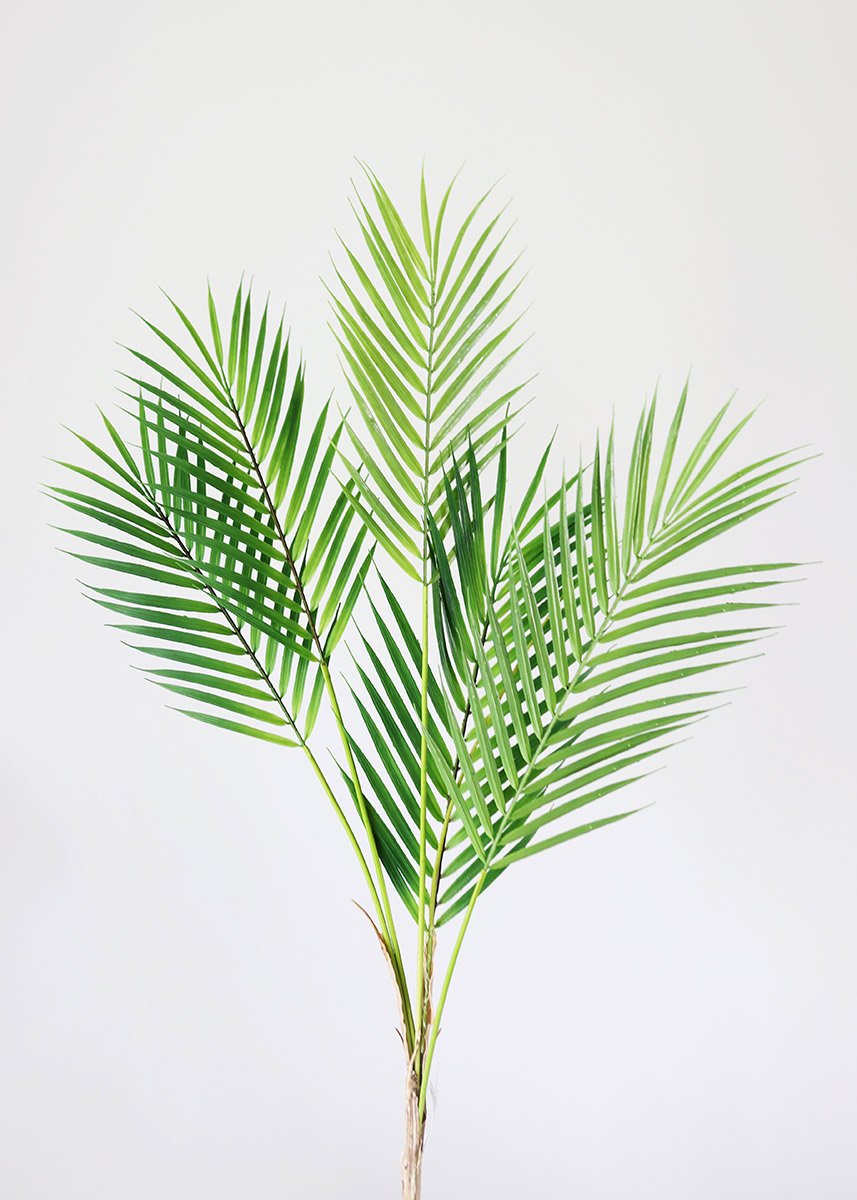 Find fake tropical plants to display indoors or outdoors, like this artificial plastic palm leaf bush. Put it in your favorite planter pot, and you never have to water to keep its leaves looking lush.