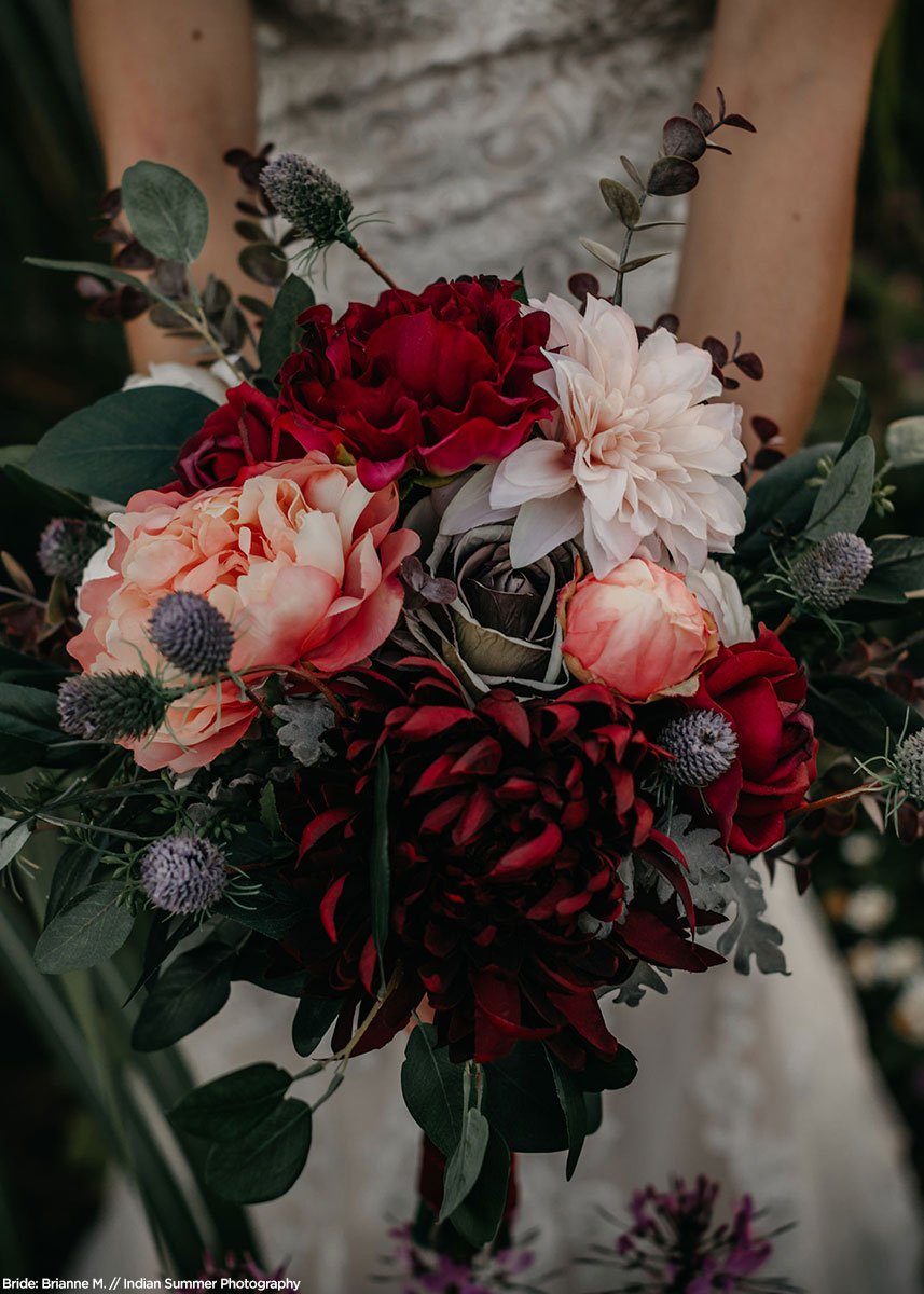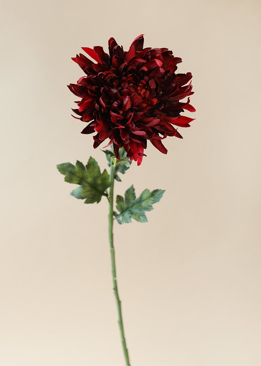 Find faux wildflowers, like this beautiful silk chrysanthemum in burgundy. This charming burgundy mum will make a great focal point in your DIY fall wedding bouquet!