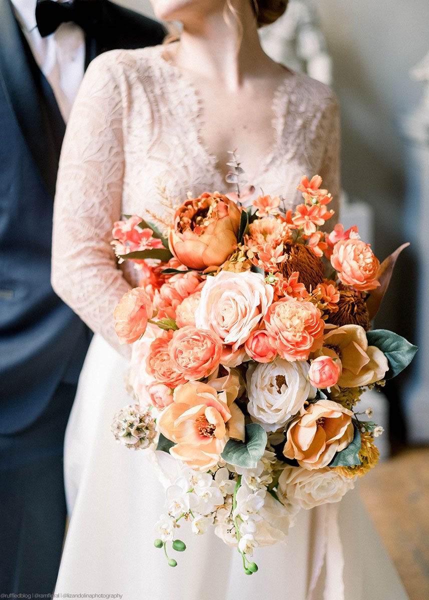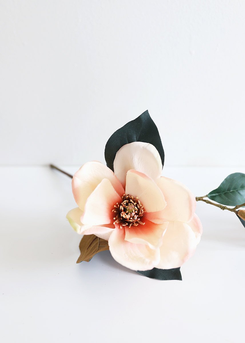 Find artificial fall flowers, like this adorable light pink magnolia silk flower with green leaf accents. It will work perfectly to soften the bold autumn hues in your DIY floral arrangements.