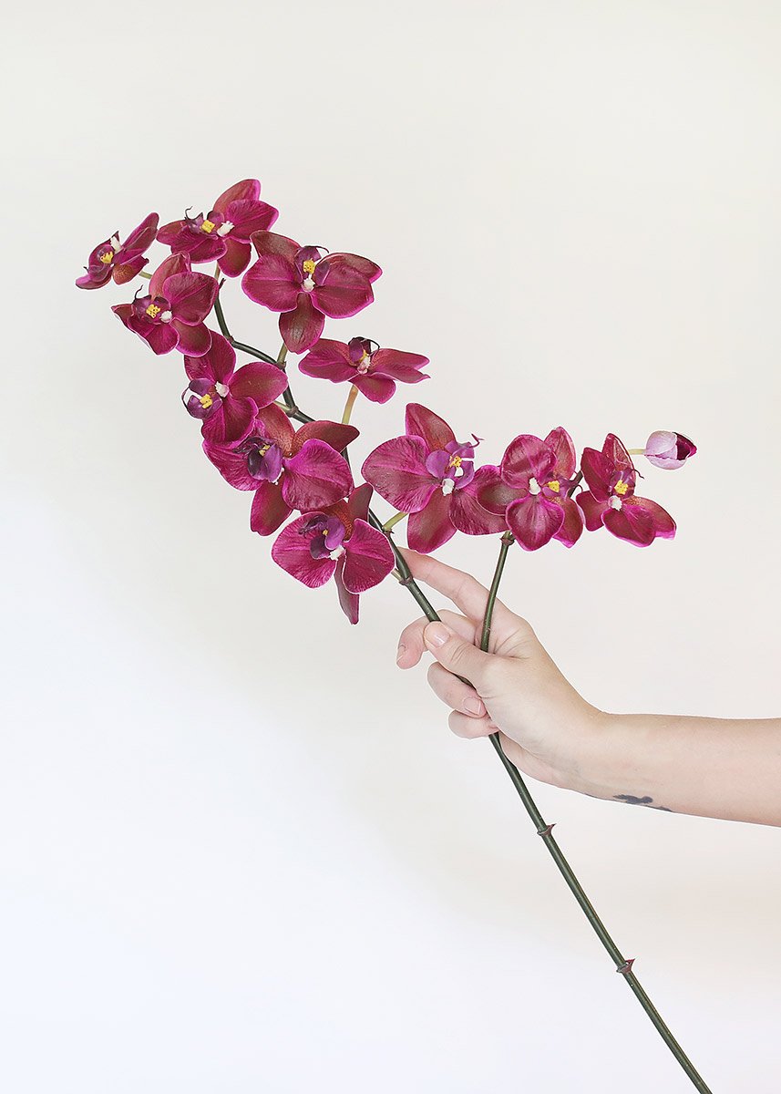 Find artificial tropical orchid flowers, like these stunning fuchsia purple phalaenopsis orchids. The life-like soft touch, bendable blooms add a rich pop of color that takes your bridal bouquet to the next level.