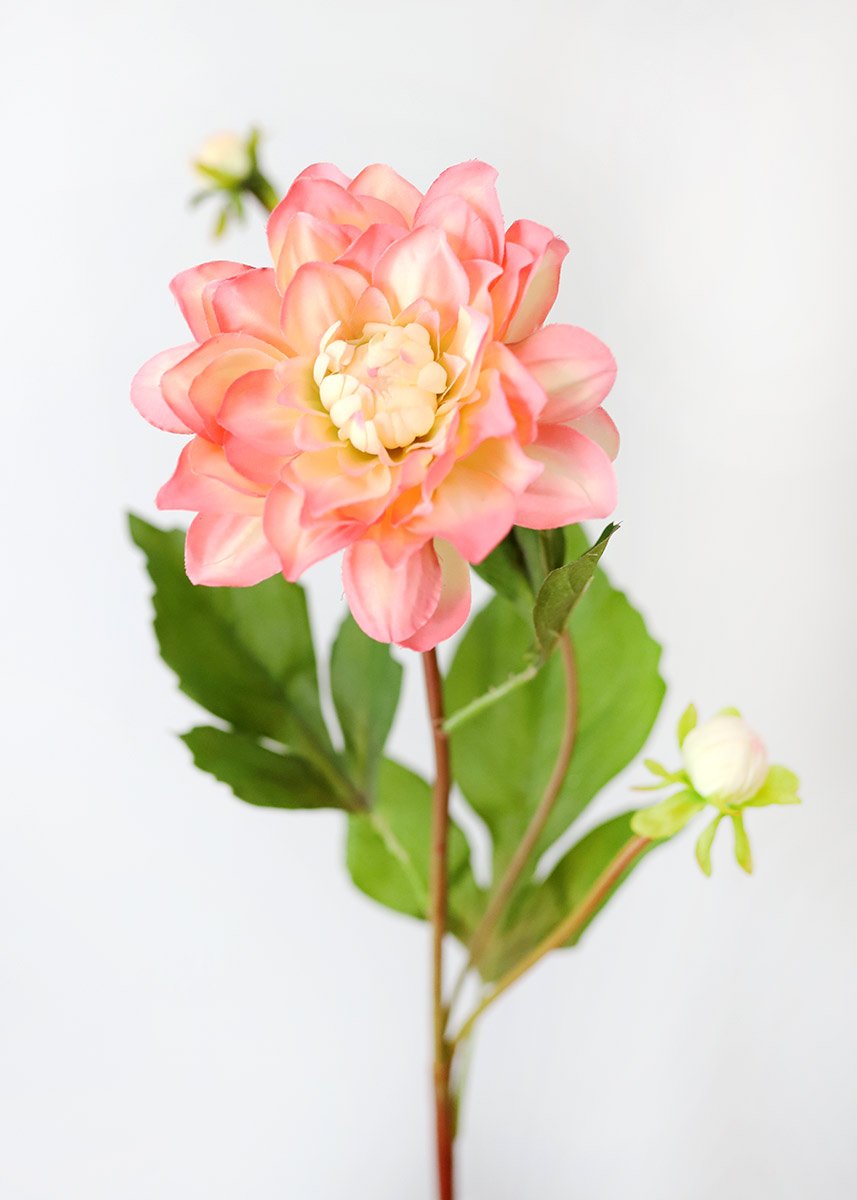 Garden dahlia silk flower spray in coral pink. Dahlia Spray has two little buds in a beautiful cream green. The perfect addition to your floral centerpieces, vase arrangements, and wedding bouquets for a splash of stunning color!