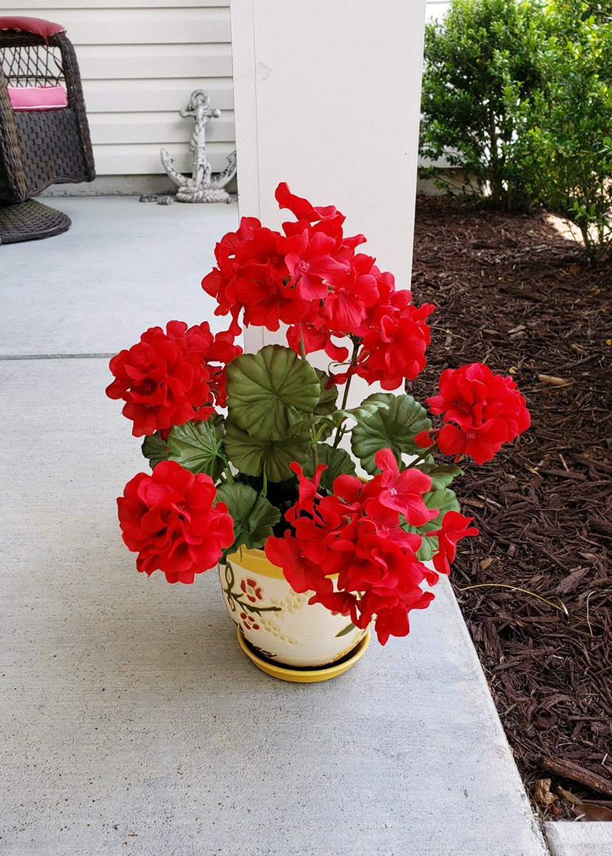 Beautiful geranium artificial flowers bush in red. These lovely red geraniums can be used indoors or outdoors for a main centerpiece with a burst of vibrant color that will be perfect for your spring events! Color may fade in direct sunlight. Add a UV Protectant Spray to keep color vibrant.