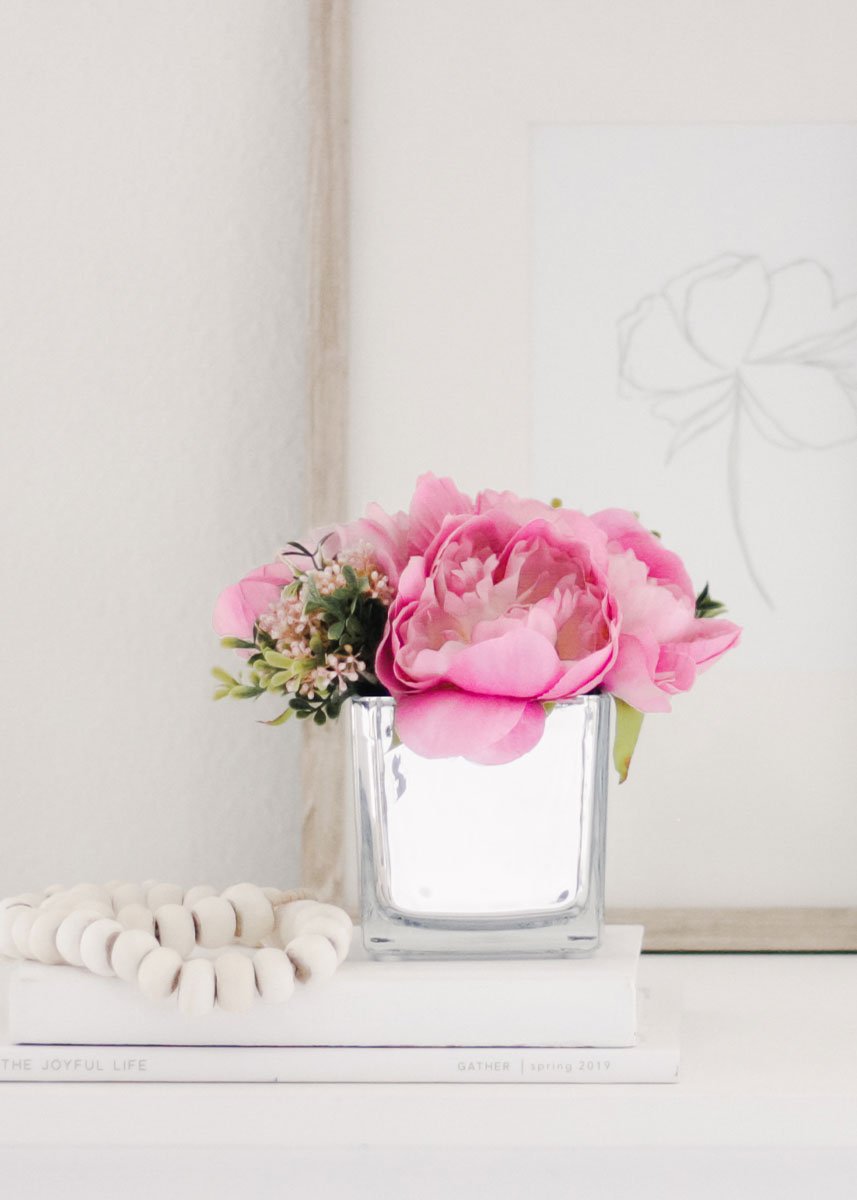 Find fake flower arrangements for stylish home decor, like this arrangement of pink artificial peonies in a square glass floral vase. It's perfect to brighten a side table or a shelf.