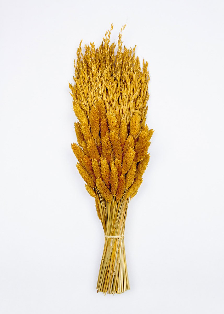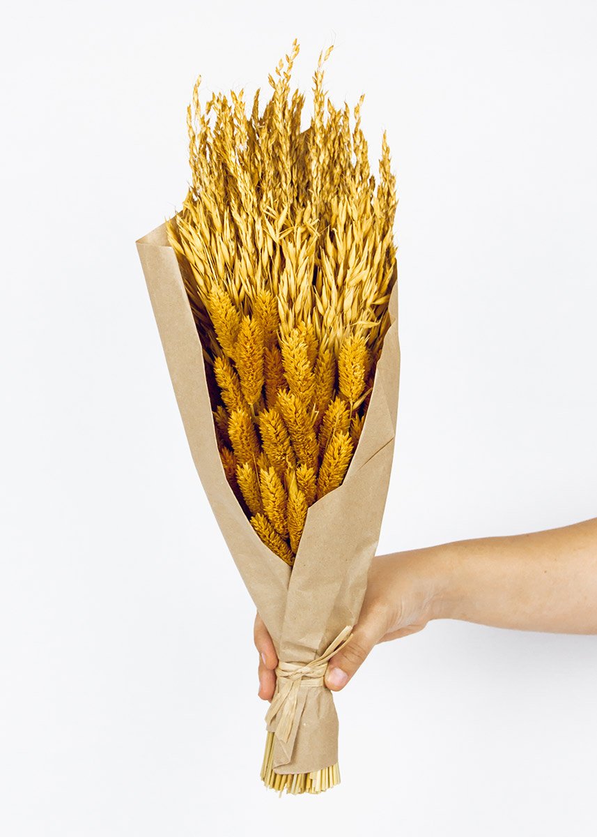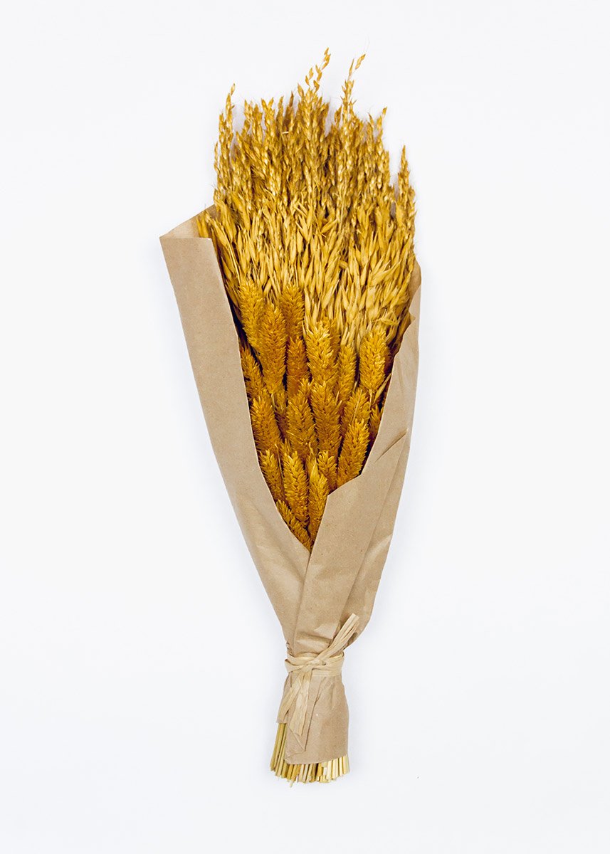 This dried grass bouquet in warm tones of saffron golden orange features oats, phalaris, and sudan natural grasses. It's wrapped in kraft paper and tied with raffia.