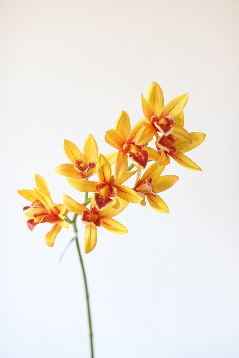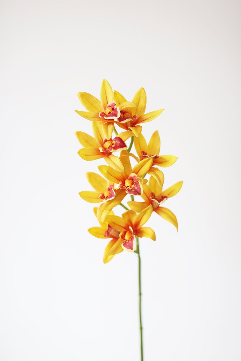 Find artificial tropical flowers, like this vibrant cymbidium orchid flower spray in golden yellow with red centers. These fake orchids lend amazing color to any wedding bouquet or home vase arrangement.