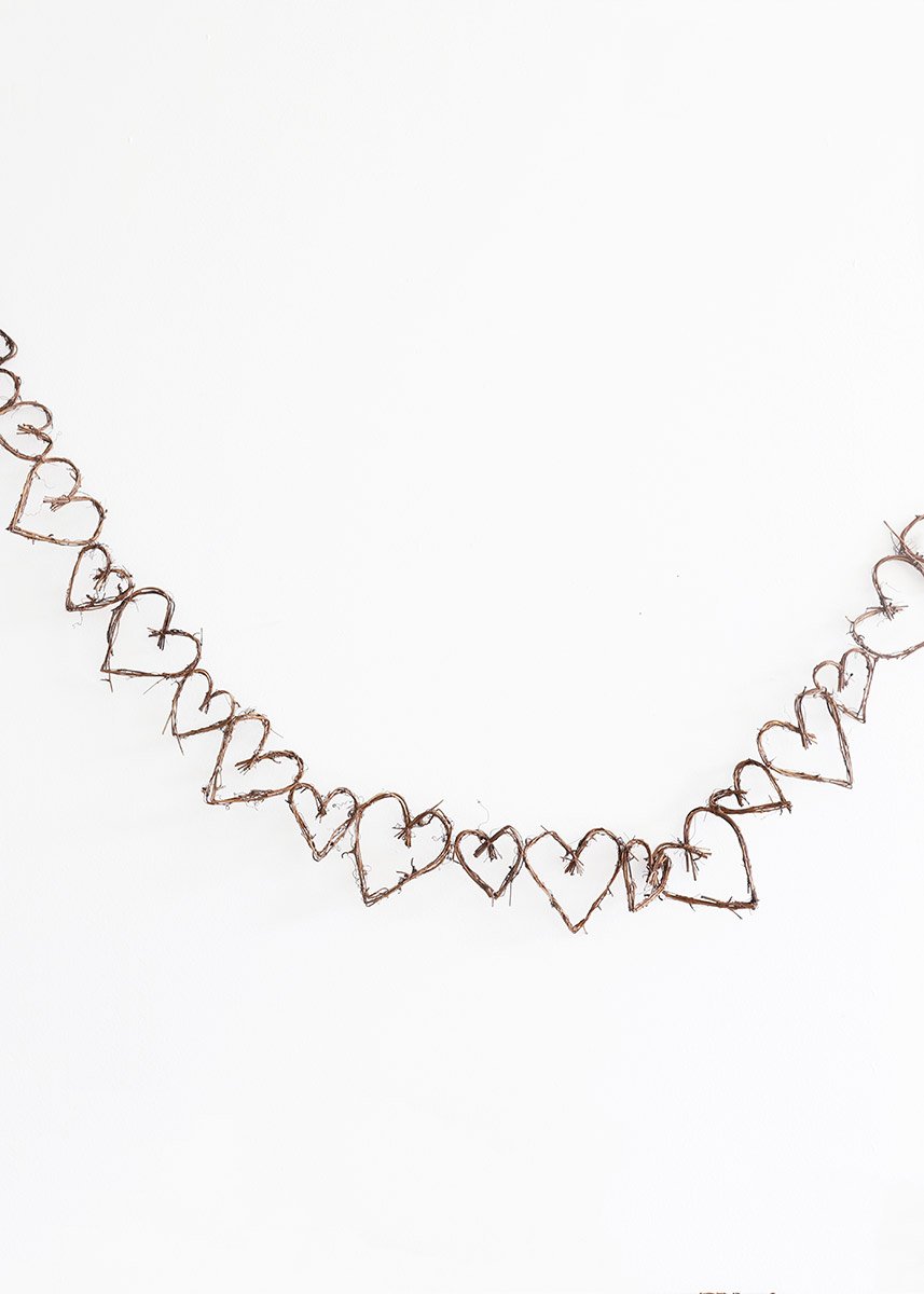 This garland is perfect for a rustic wedding. It is made up of grapevines twined into heart shapes. It alternates larger hearts and smaller hearts. Add ribbon and flowers to match your wedding colors, or leave plain for a sweet wedding decoration.