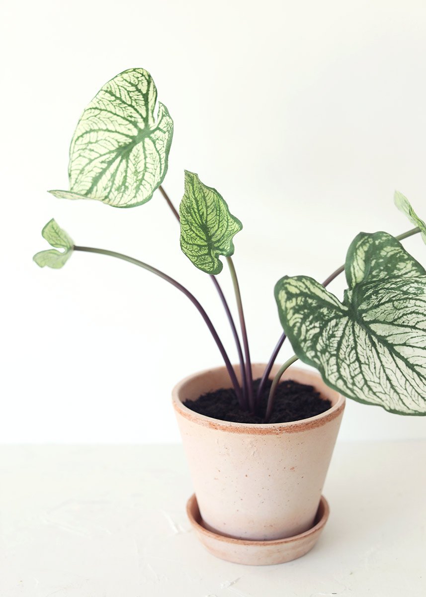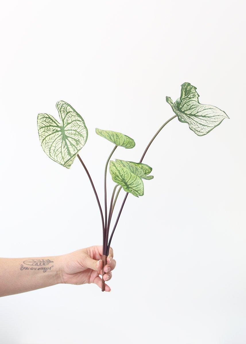 Find care-free artificial indoor plants that keep your home bright and lively, like this fake caladium elephant ear plant. These gorgeous two tone green tropical leaves feature realistic variegated cream coloring.