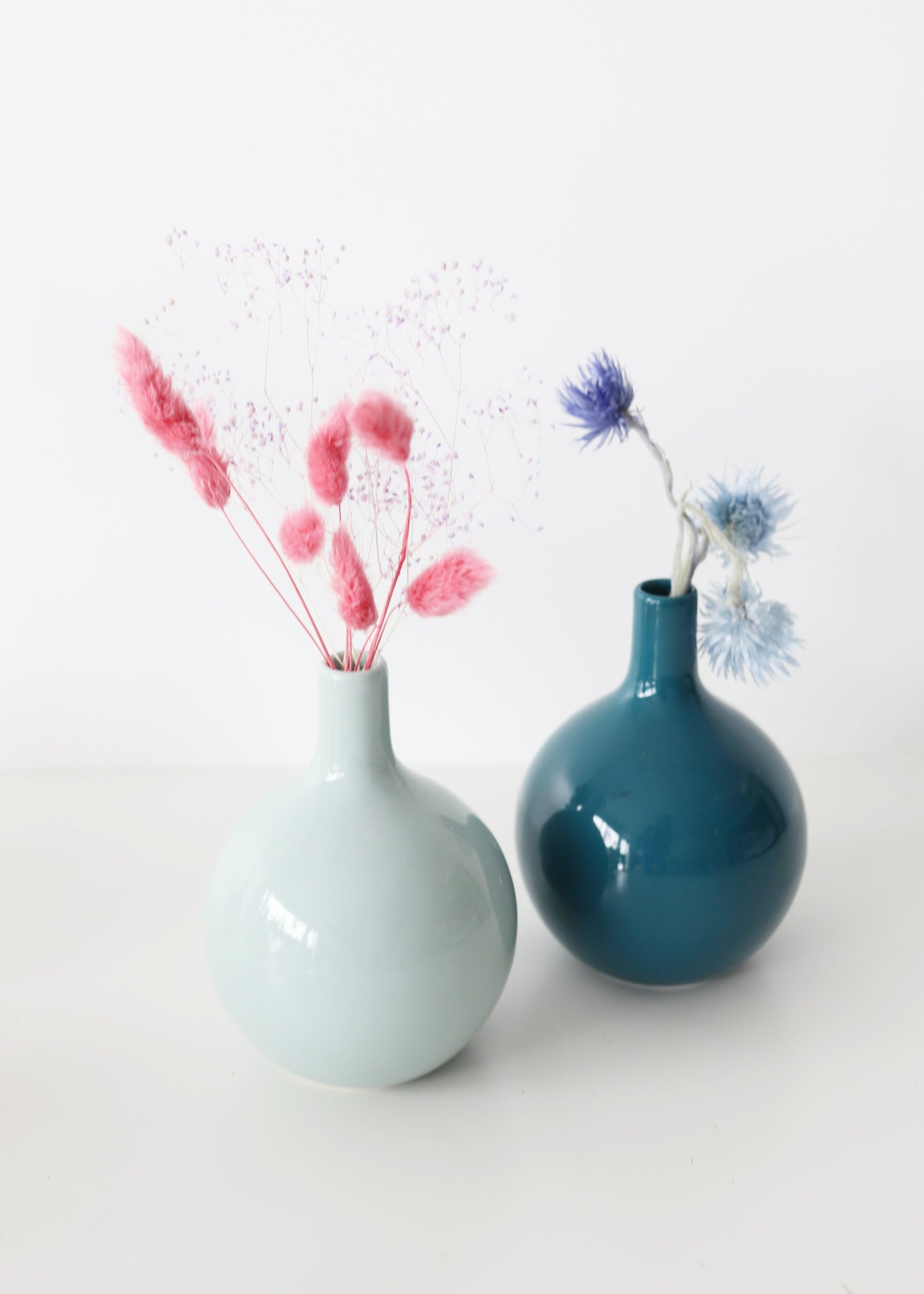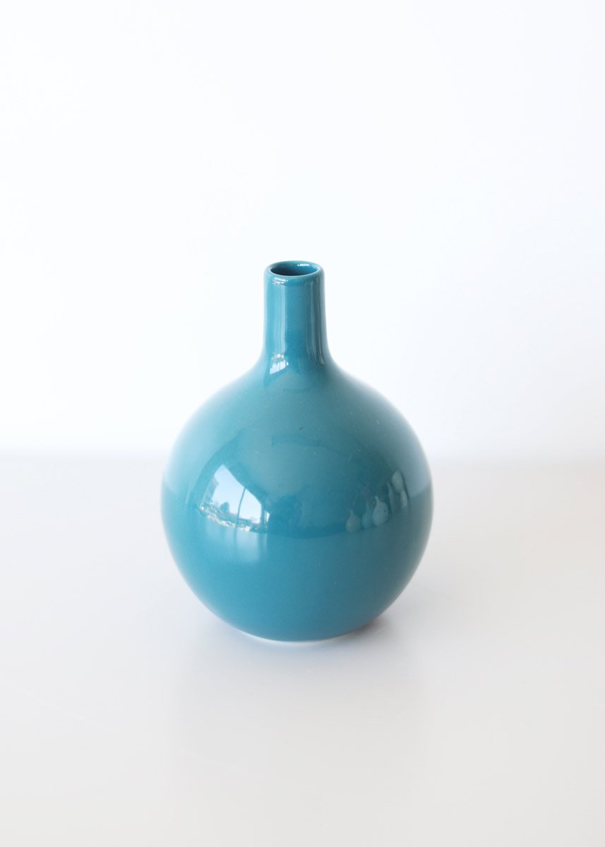 Add a pop of color to your mid-century modern home decor with this stunning teal bud vase. Handmade in Brooklyn by Franca, a multi-cultural women-owned studio, this unique vase can easily be styled with just a few dried flowers, a sprig of eucalyptus, or your favorite silk stems.