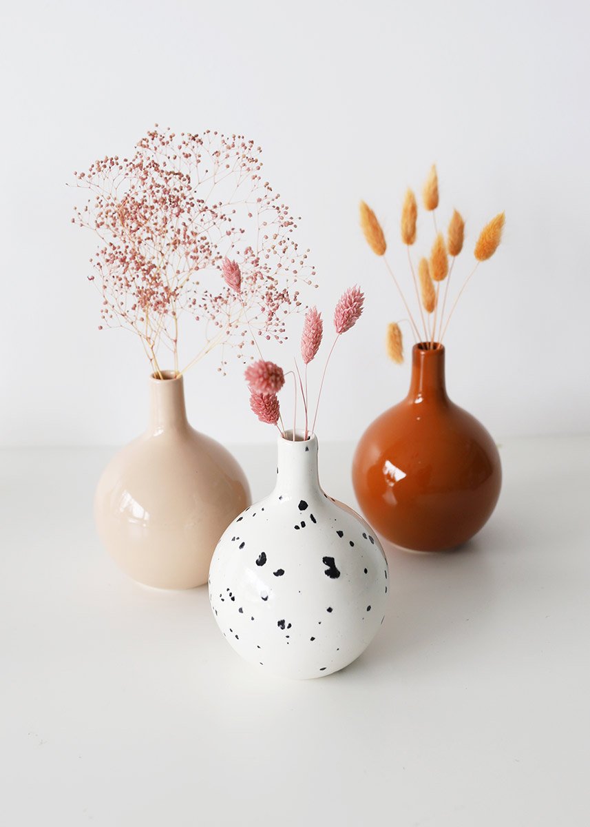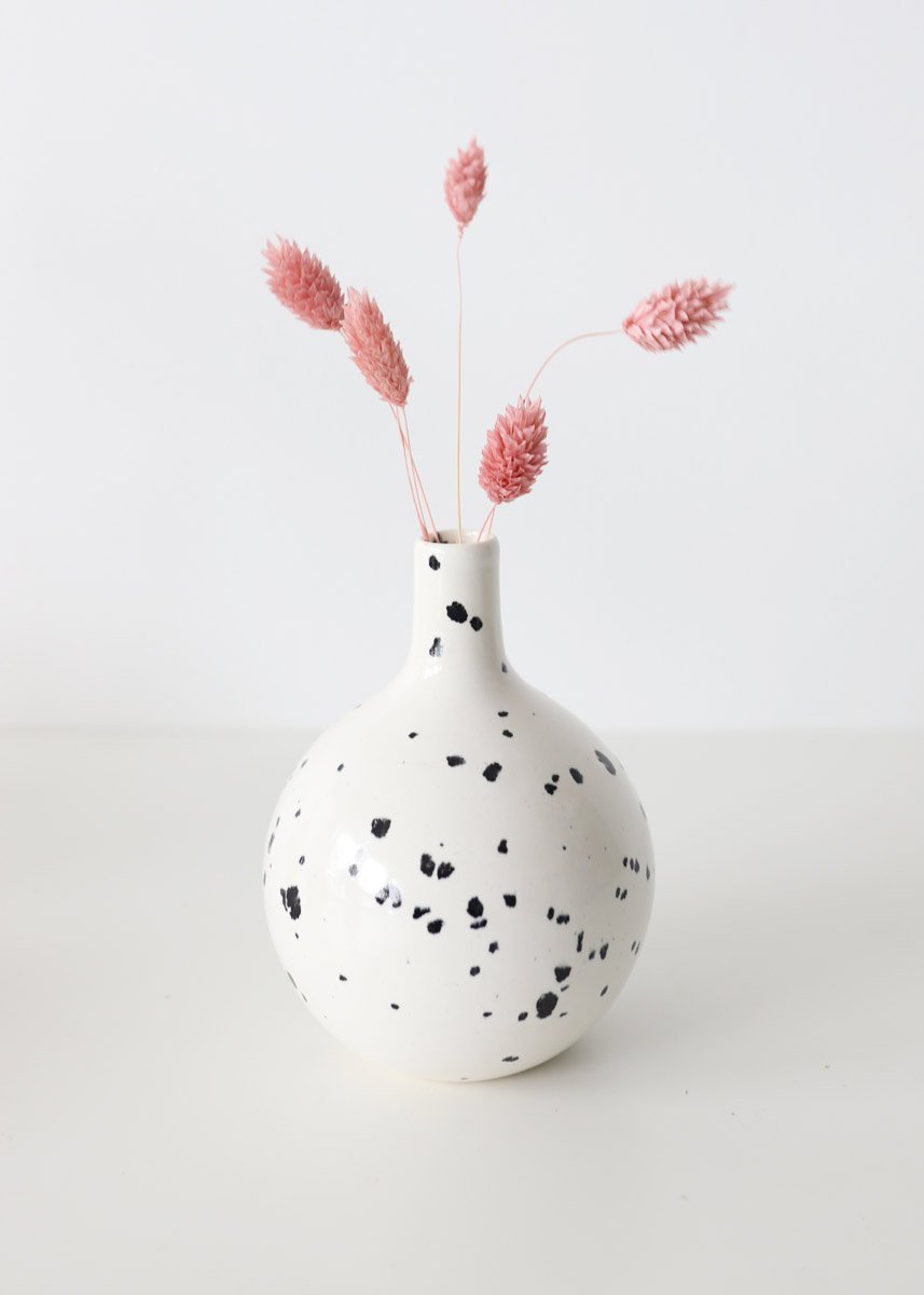 Handmade and utterly unique, this speckled earthenware vase is the perfect accent to your mid-century modern home decor. Style with dried flowers, your favorite silk blooms, or a sprig or two of eucalyptus for a coffee table look that lasts! Each vase is handmade by Franca, a multicultural and women-owned studio based in Brooklyn, NY.