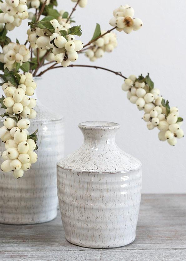 Adorable home flower vases make simple yet charming table decor. This distressed white ceramic bud vase from the Hari Collection has brown and green speckles.