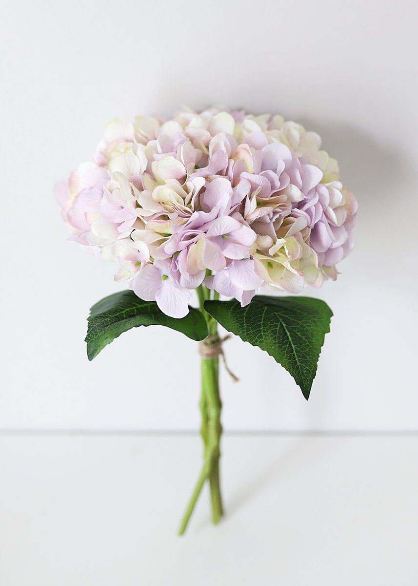 This beautiful bouquet bundle features pastel lavender silk hydrangeas. 3 individual stems are tied with jute and can be easily separated for your wedding designs.