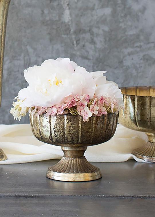 Find gold metal floral containers for your vintage wedding centerpieces like this beautiful distressed gold metal compote bowl. Just fill with your favorite silk flowers to create a simple yet gorgeous arrangement you can display in your home later.