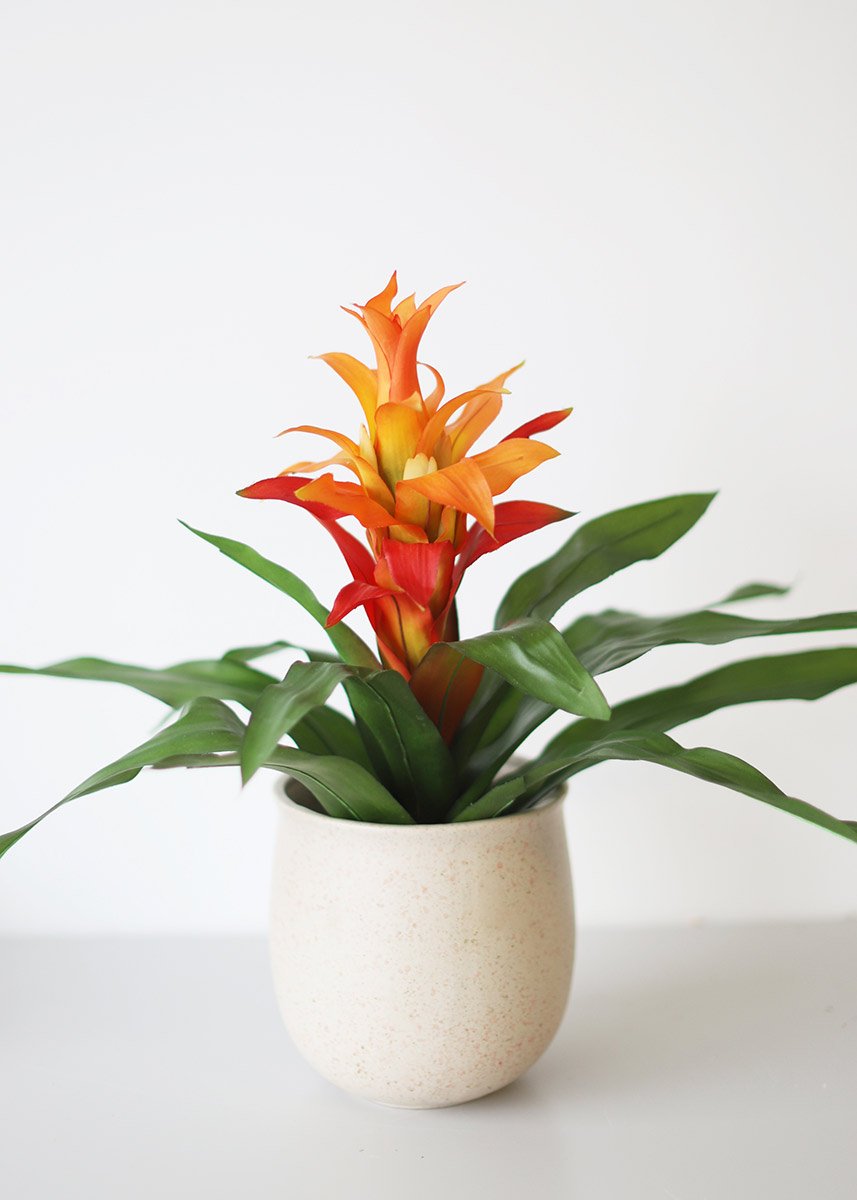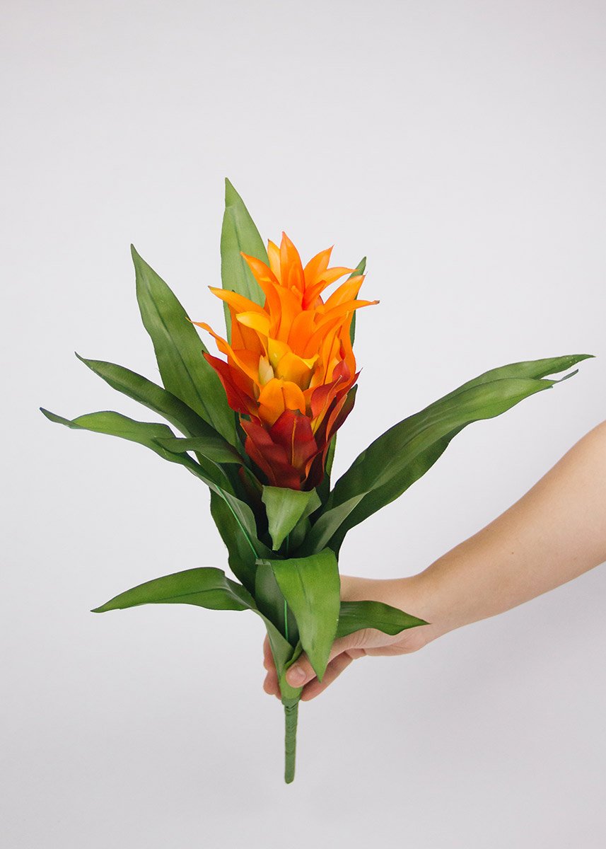 Get artificial tropical flowers, like this orange and flame red Hawaiian bromeliad plant. Give your destination wedding centerpieces an exotic look!