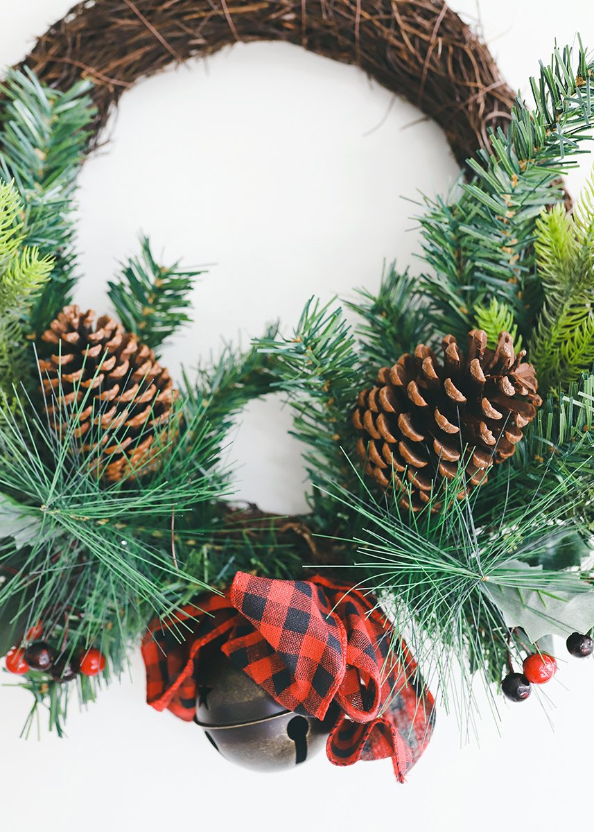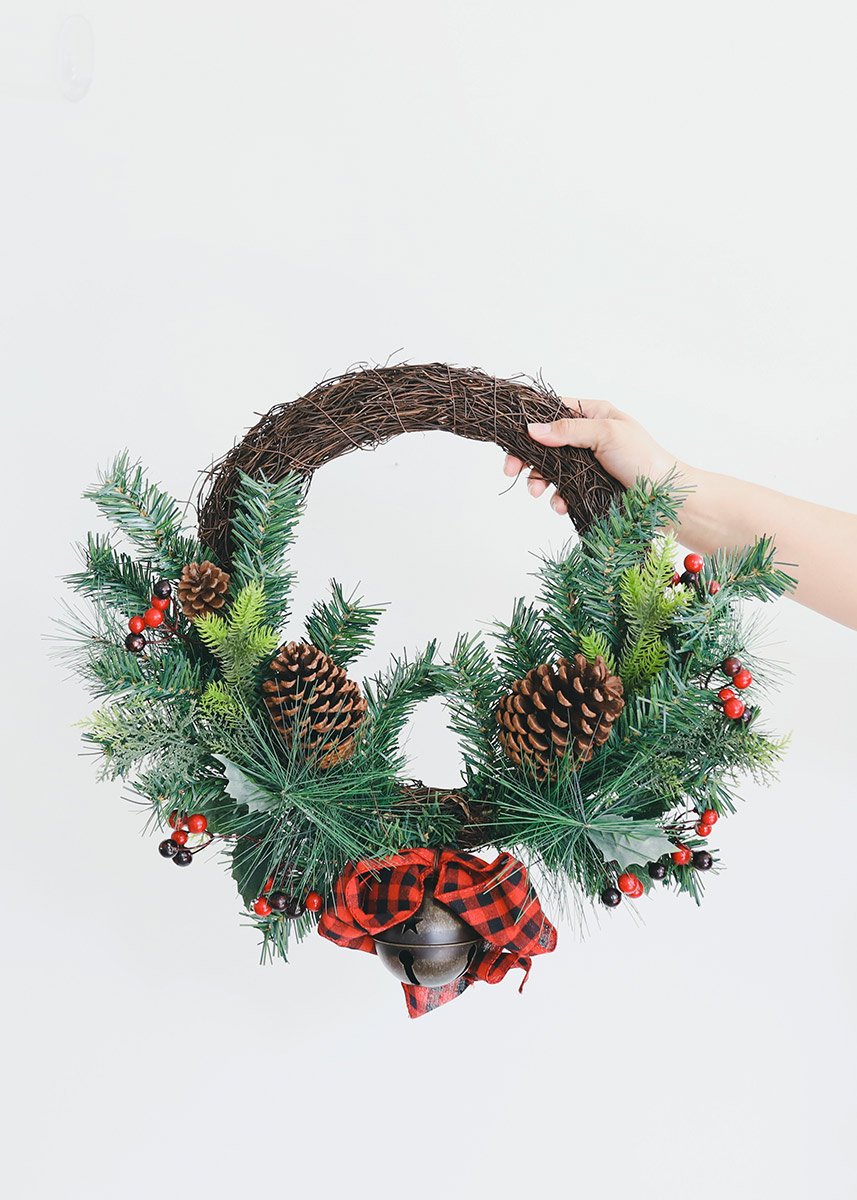 Find artificial Christmas wreaths, like this beautiful half wreath on a twig base that creates a modern asymmetrical look. It has pine, cones, black and red berries, a jingle bell, and a red plaid bow.