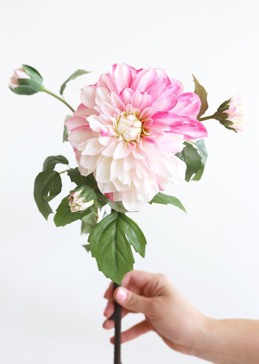 Find artificial flowers for your DIY wedding bouquet, like this white fake dahlia flower stem splashed with fuchsia pink hues. Such a gorgeous silk bloom to sweeten any floral design.