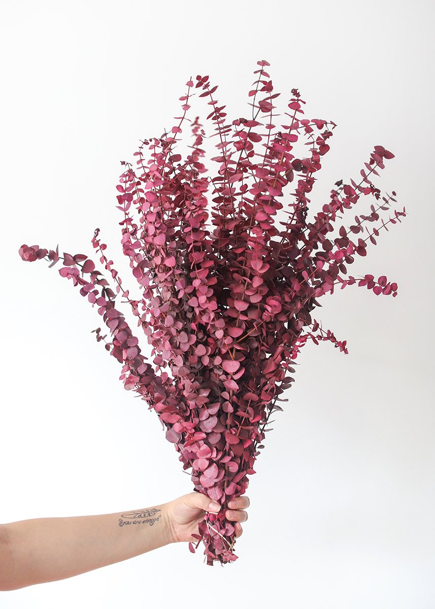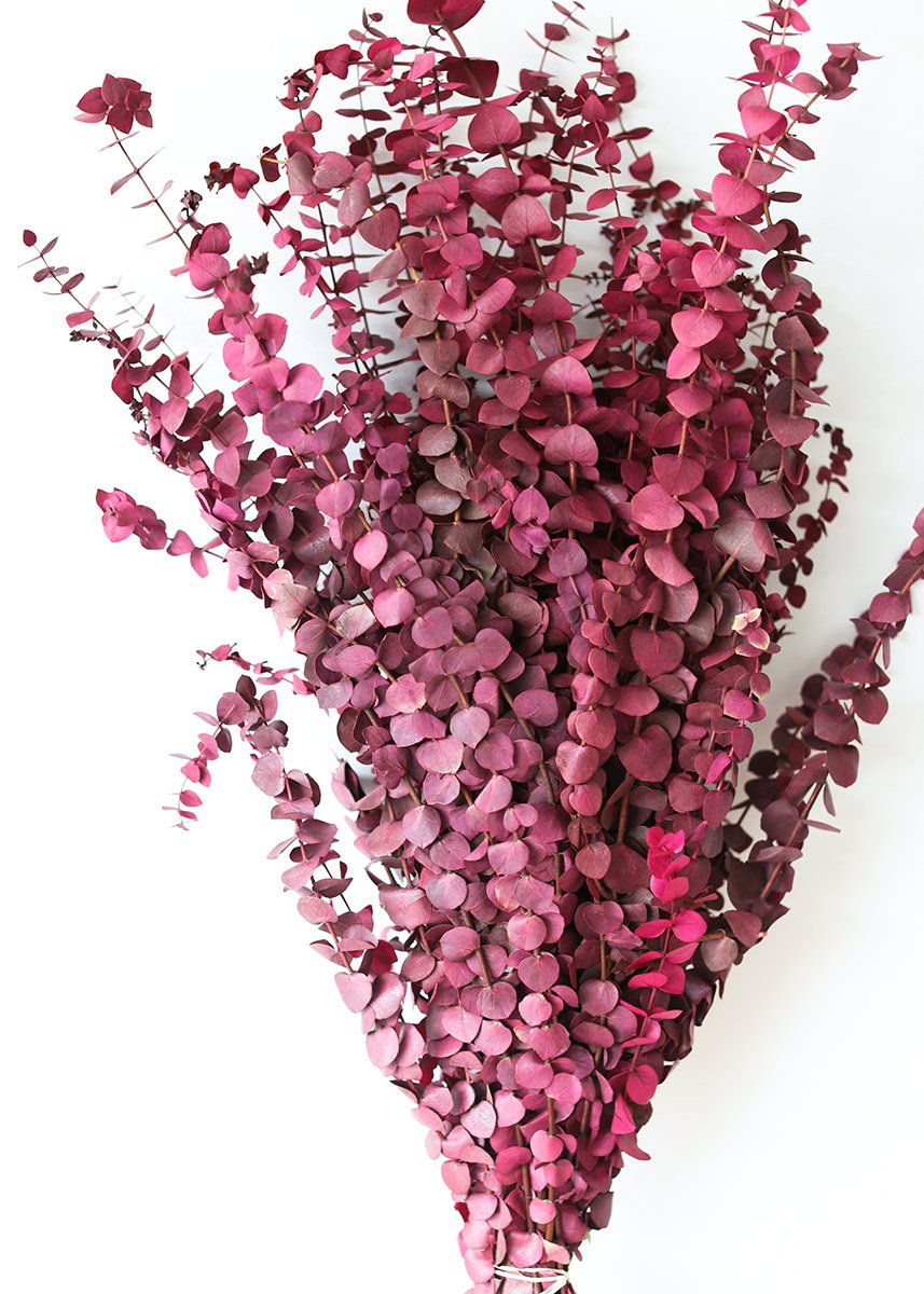 Add a pop of rich color with this beautiful deep berry pink preserved spiral eucalyptus. This abundant bundle is great for use in floral crafts such as a DIY wreath, or simply style alone in your favorite urn or vase.