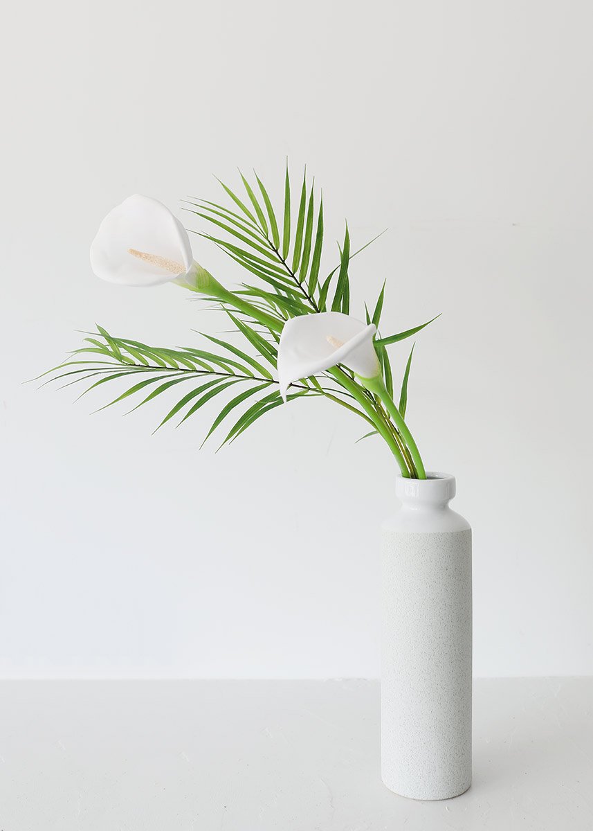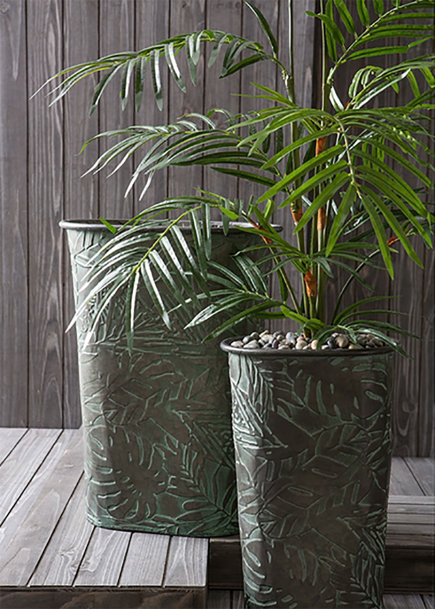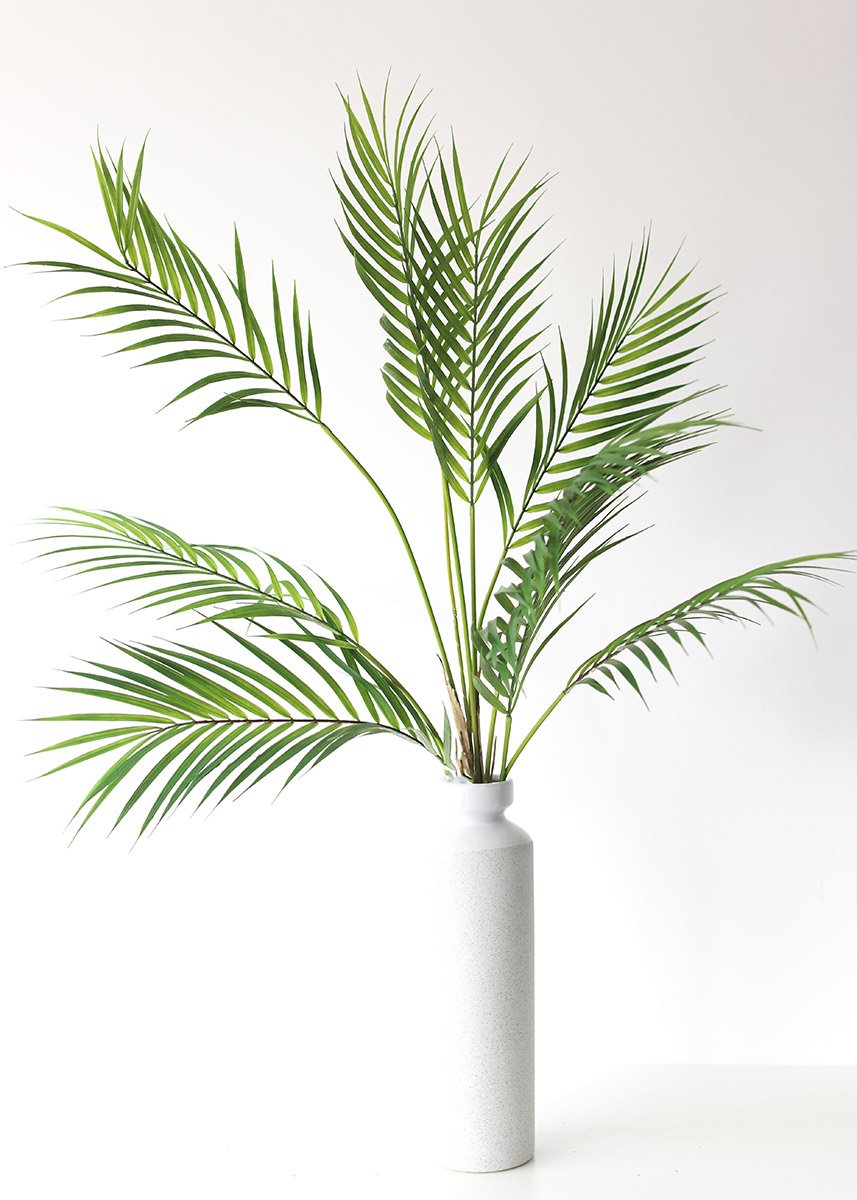 Find fake outdoor tropical leaves, like this plastic Areca palm leaf plant. Simply place it in your favorite planter pot, and you never have to water it to maintain its awesome lush look.