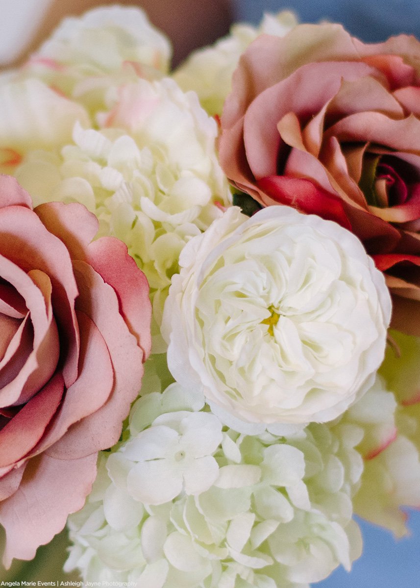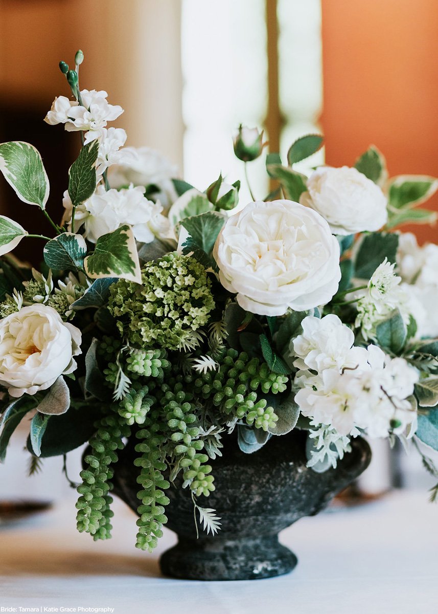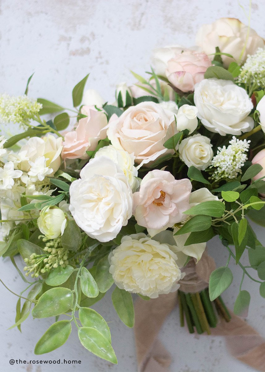 Get hassle-free silk white wedding flowers just as pretty and realistic as fresh, like this beautiful, faux English cabbage rose stem in white. This stylish and classic white artificial rose is the perfect focal point in any bouquet or arrangement!