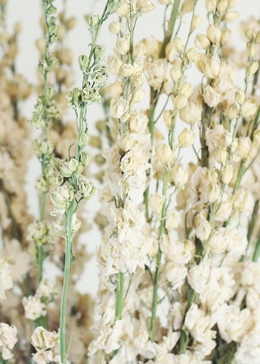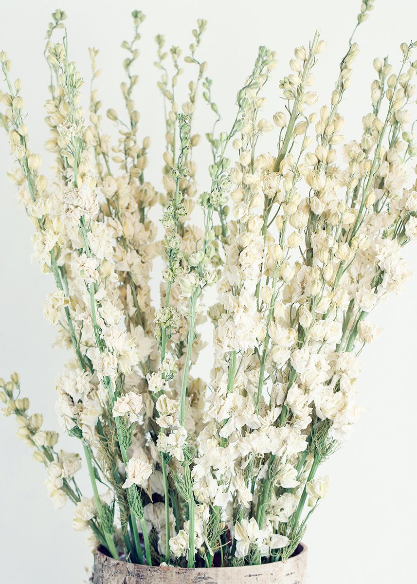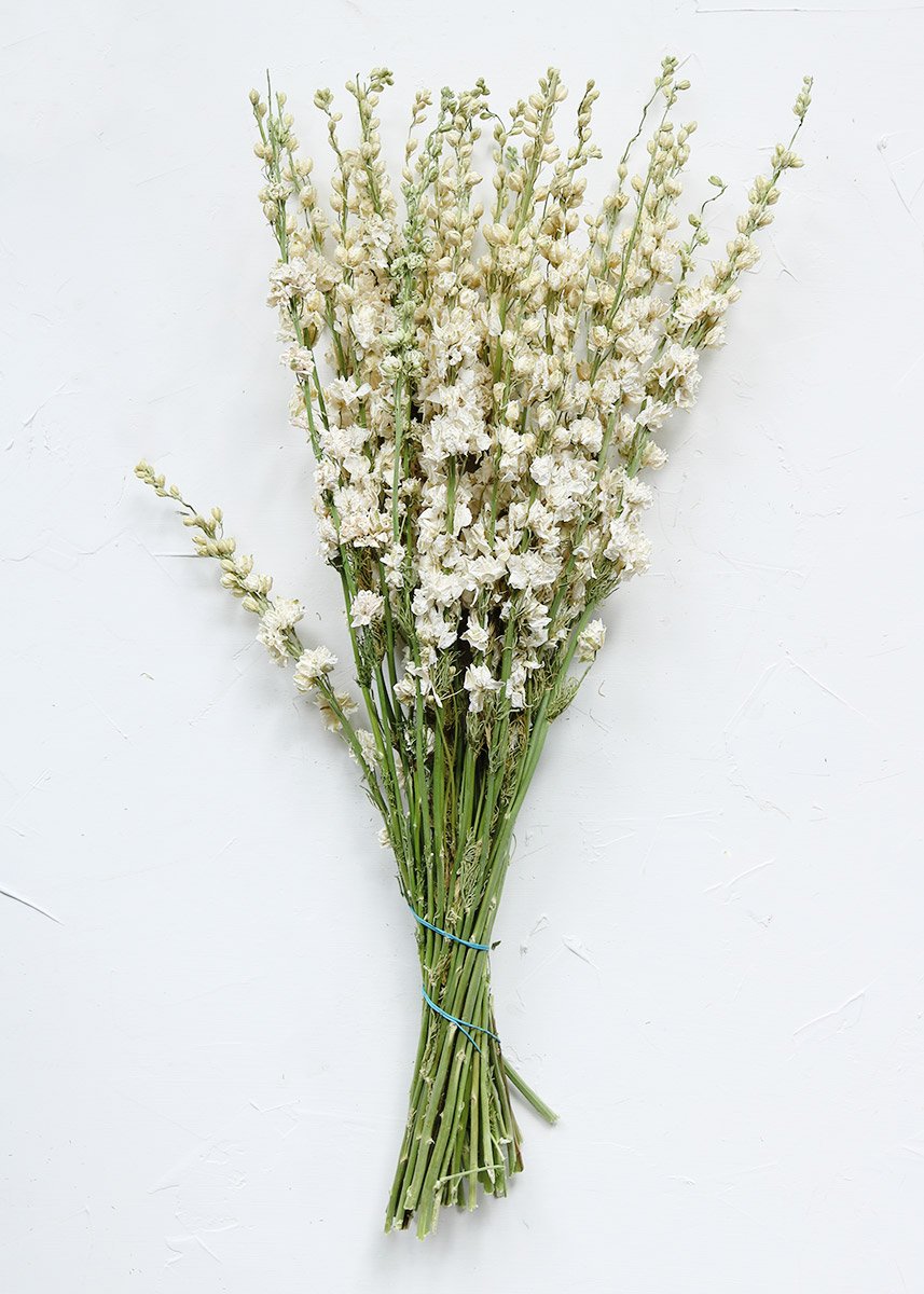 DIY your own wildflower bridal bouquet with everlasting dried flowers from Afloral.com. Add these gorgeous white dried larkspur flowers to your fall wedding centerpieces.